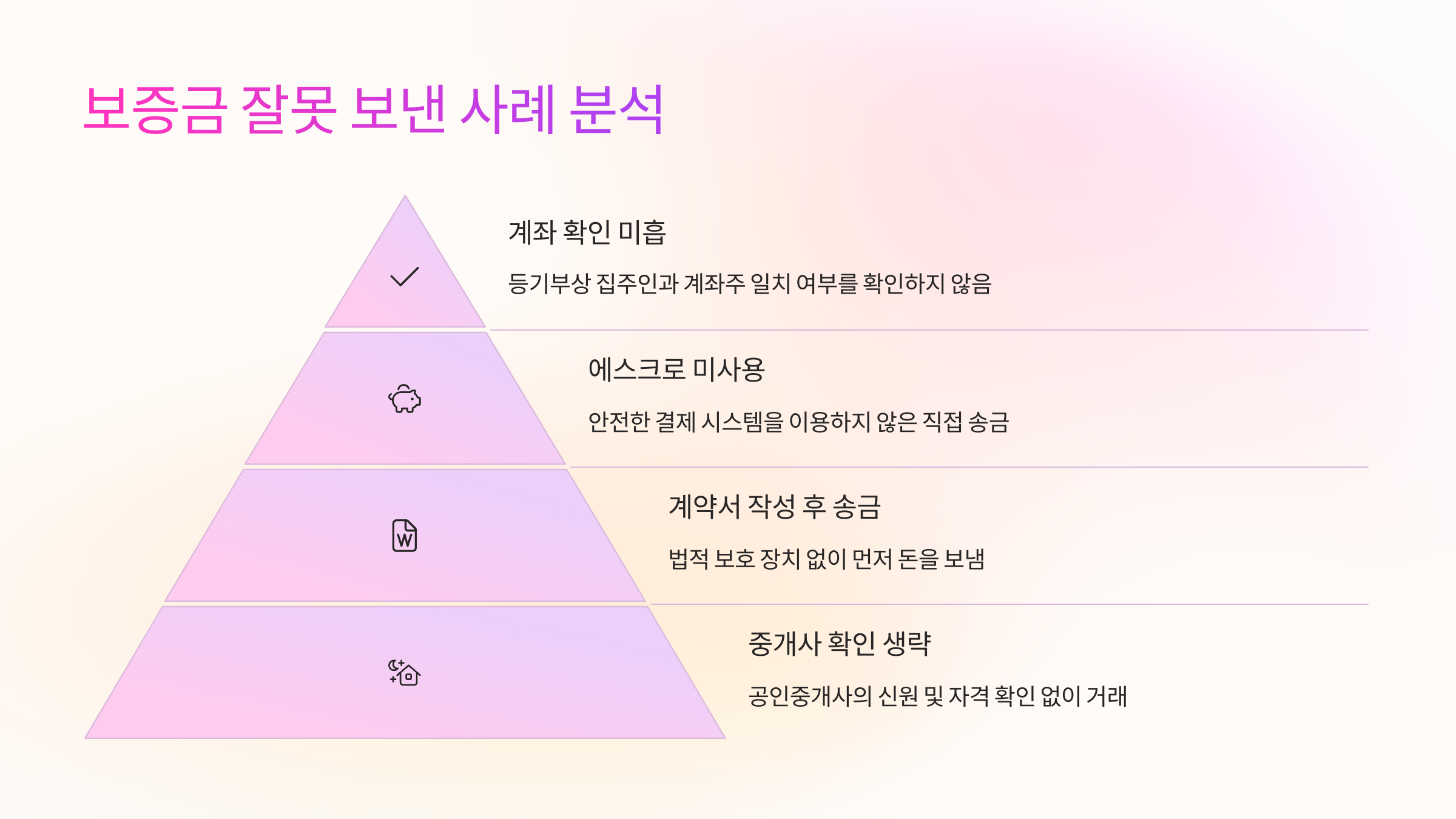 월세 계약에서 가장 흔하면서도 심각한 실수가 바로 ‘보증금 이체 실수’예요. 이건 단순한 은행 실수가 아니라, 잘못된 명의 계좌로 돈을 보내면서 생기는 보증금 사기 피해로 이어질 수 있어요. 특히 계약 당일 정신없이 계약서를 작성하고 “이 계좌로 보내세요~”라는 말만 믿고 확인 없이 입금하는 경우가 많죠.