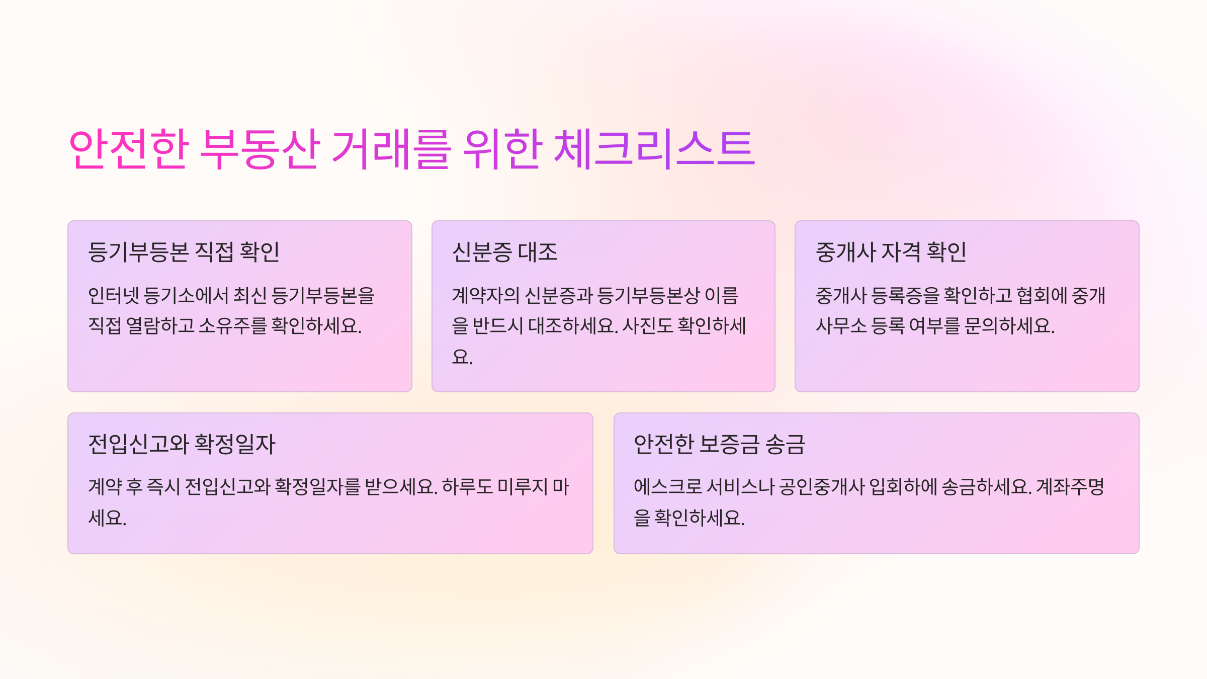 | 소유자 명의 확인 | 등기부등본과 신분증 대조 | 이름·주민번호 앞자리 불일치 시 의심 |