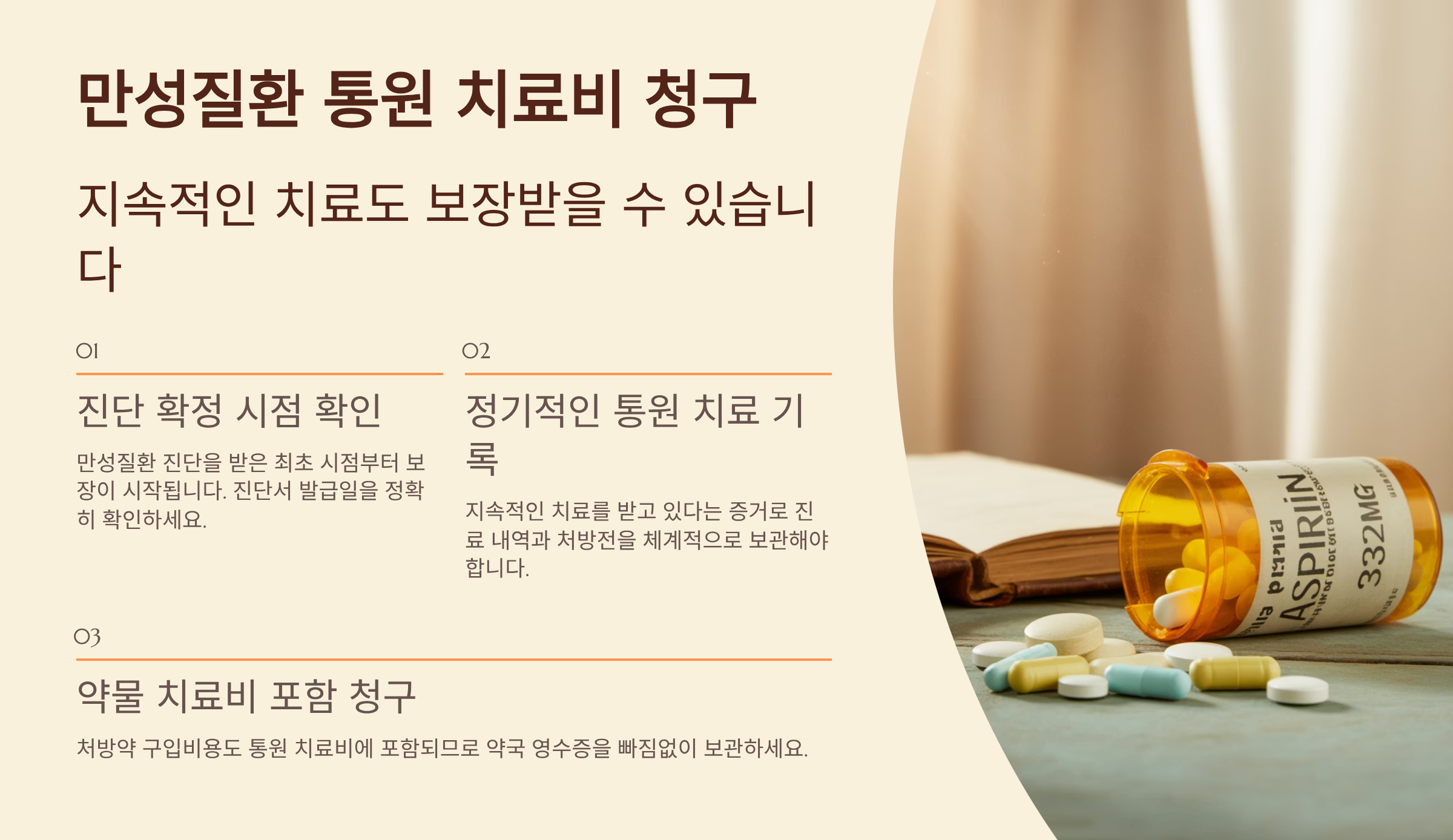 결론부터 말하자면, 네! 만성질환도 진단 및 치료 목적의 진료라면 통원 치료비 청구가 가능해요. 고혈압, 당뇨, 갑상선 질환, 고지혈증 등 만성질환을 정기적으로 관리하는 경우 실손보험 청구 대상이에요.