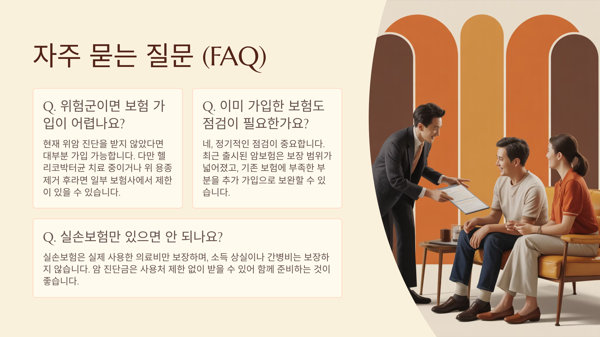 이러한 요소들이 있다면, 국가 검진 대상자 여부와 상관없이 개인적으로 더 촘촘한 보험 설계를 고민해야 해요. 보험은 발생 가능성이 높은 위험을 커버할수록 효율적이기 때문에, 위암 고위험군이라면 진단금 중심 설계가 핵심이 돼요.