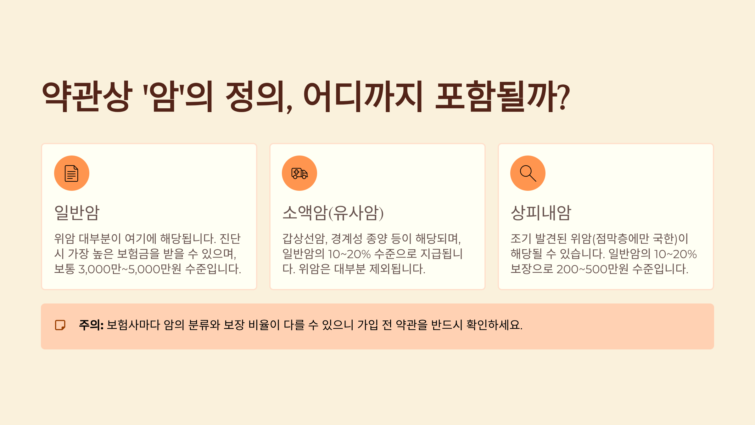 암 보험이라고 해서 모든 암을 동일하게 보장하지는 않아요. 약관상 ‘암’의 정의에 따라 보장 범위가 다르기 때문에, 가입 전에 반드시 해당 조항을 확인해야 해요. 특히 위암은 조기 발견되는 경우 상피내암이나 경계성 병변으로 진단되는 경우가 많아요.