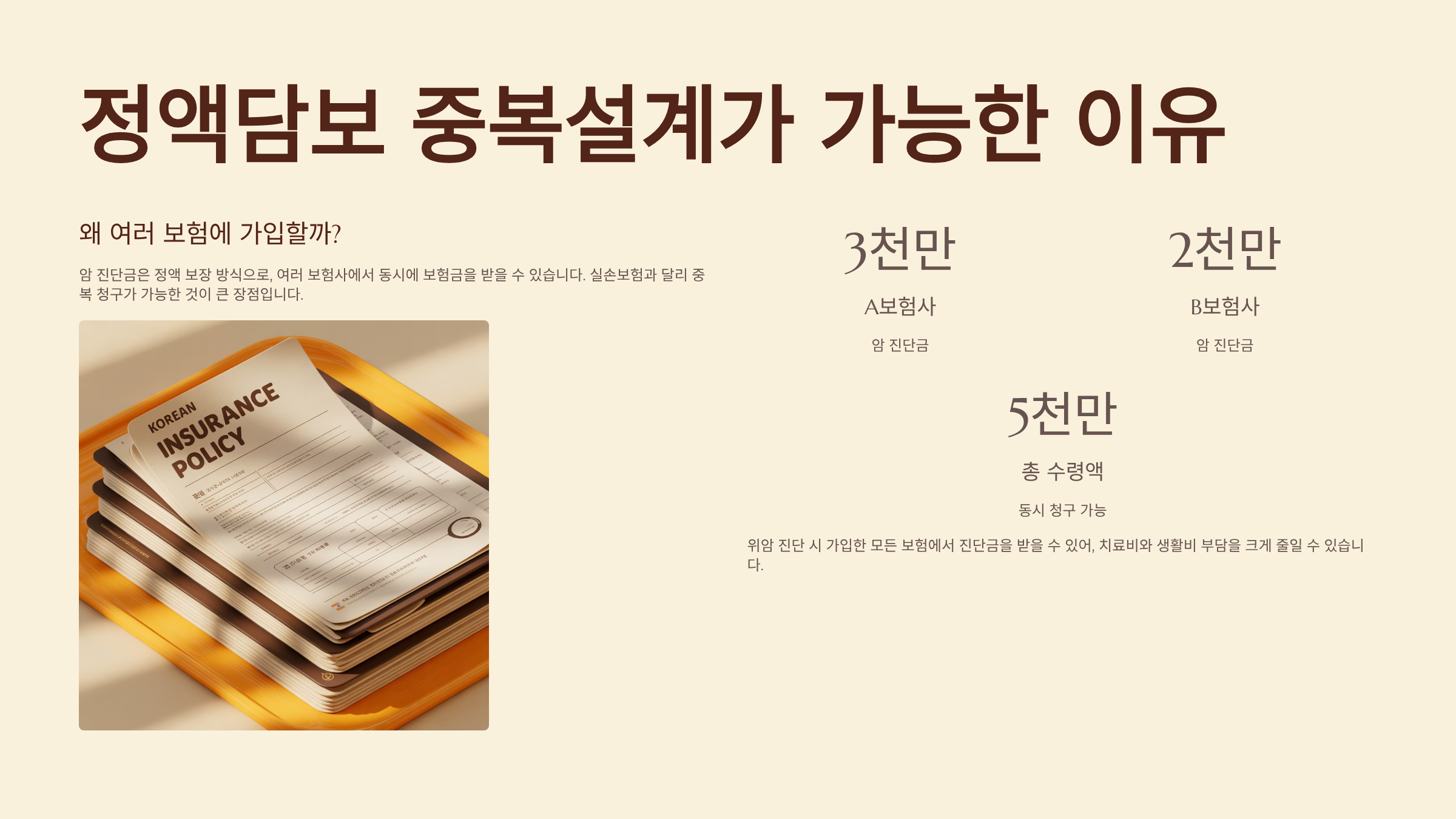 위험군일수록 진단 즉시 목돈이 필요하다는 점에서 중복 가능한 담보를 얼마나 탄탄하게 쌓느냐가 보험 전략의 핵심이에요. 동일한 보험사 상품을 여러 개 가입할 순 없지만, 보험사만 다르면 전략적으로 설계할 수 있어요.