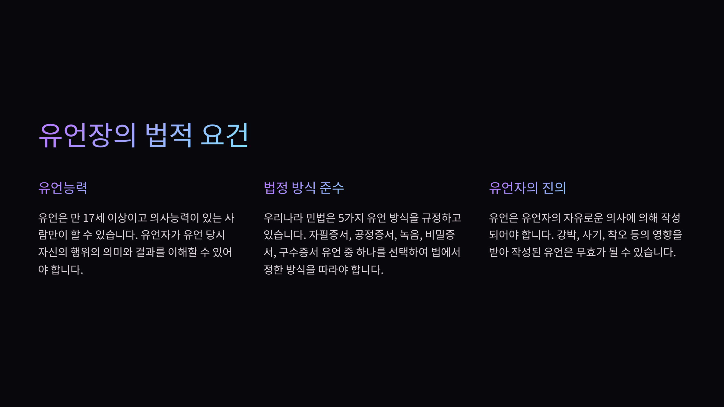 | 법적 형식 준수 | 민법이 규정한 5가지 유언 방식(자필, 녹음, 공정증서, 비밀증서, 구수증서) 중 하나를 따라야 함 |