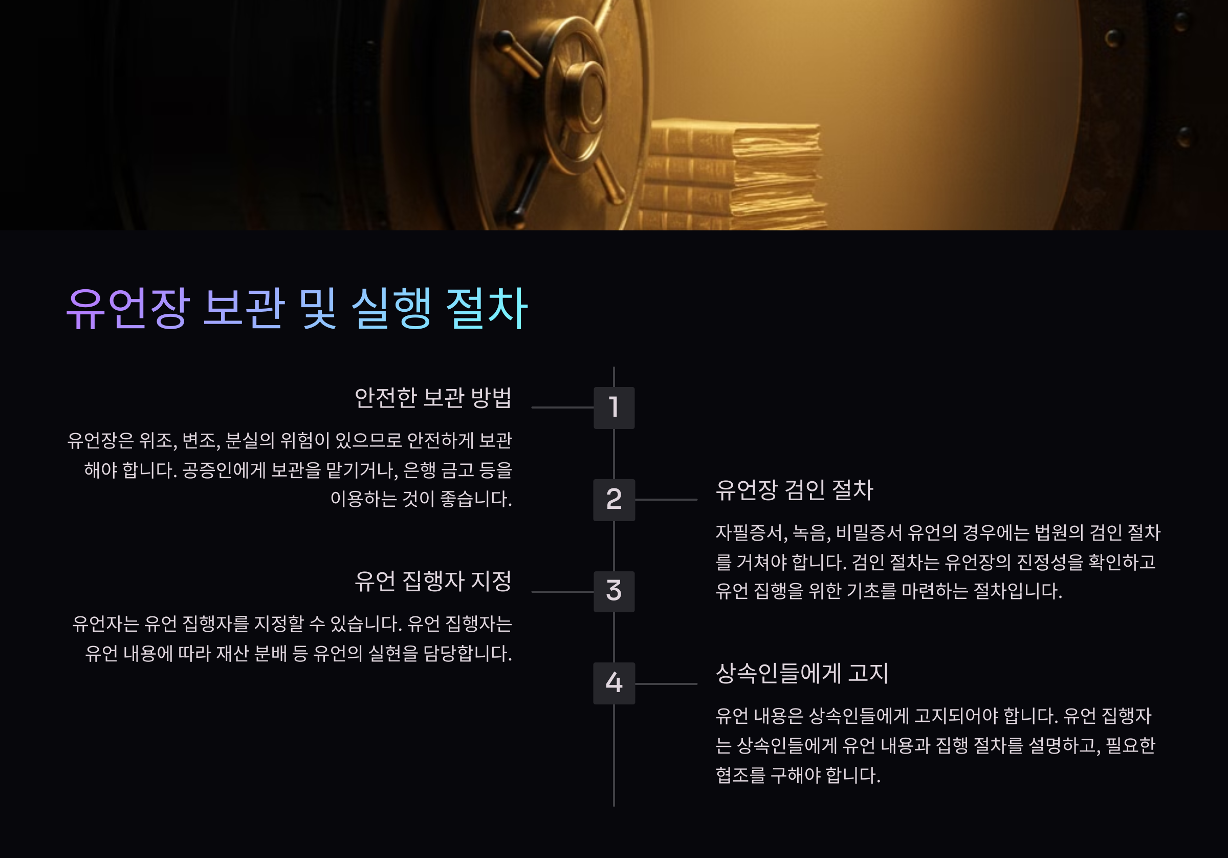 | 유언장 보관 장소 지정 | 공증 사무소, 변호사 사무실, 은행 금고 등에 보관하여 변조 및 분실 방지 |