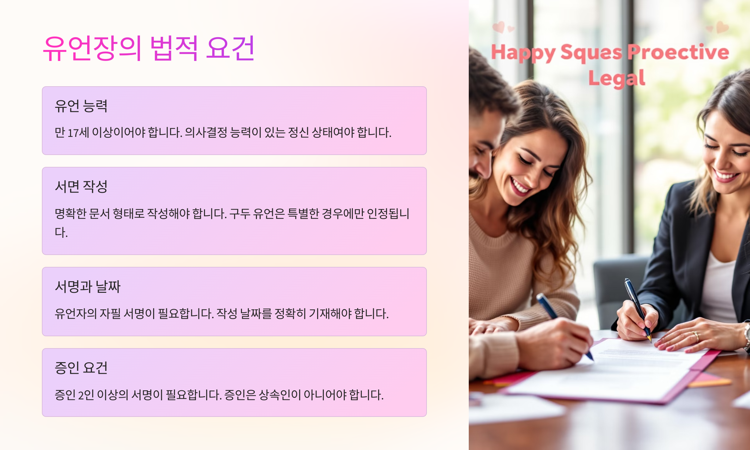 | 유언의 명확성 | 재산 분배 내용이 명확해야 해요. |