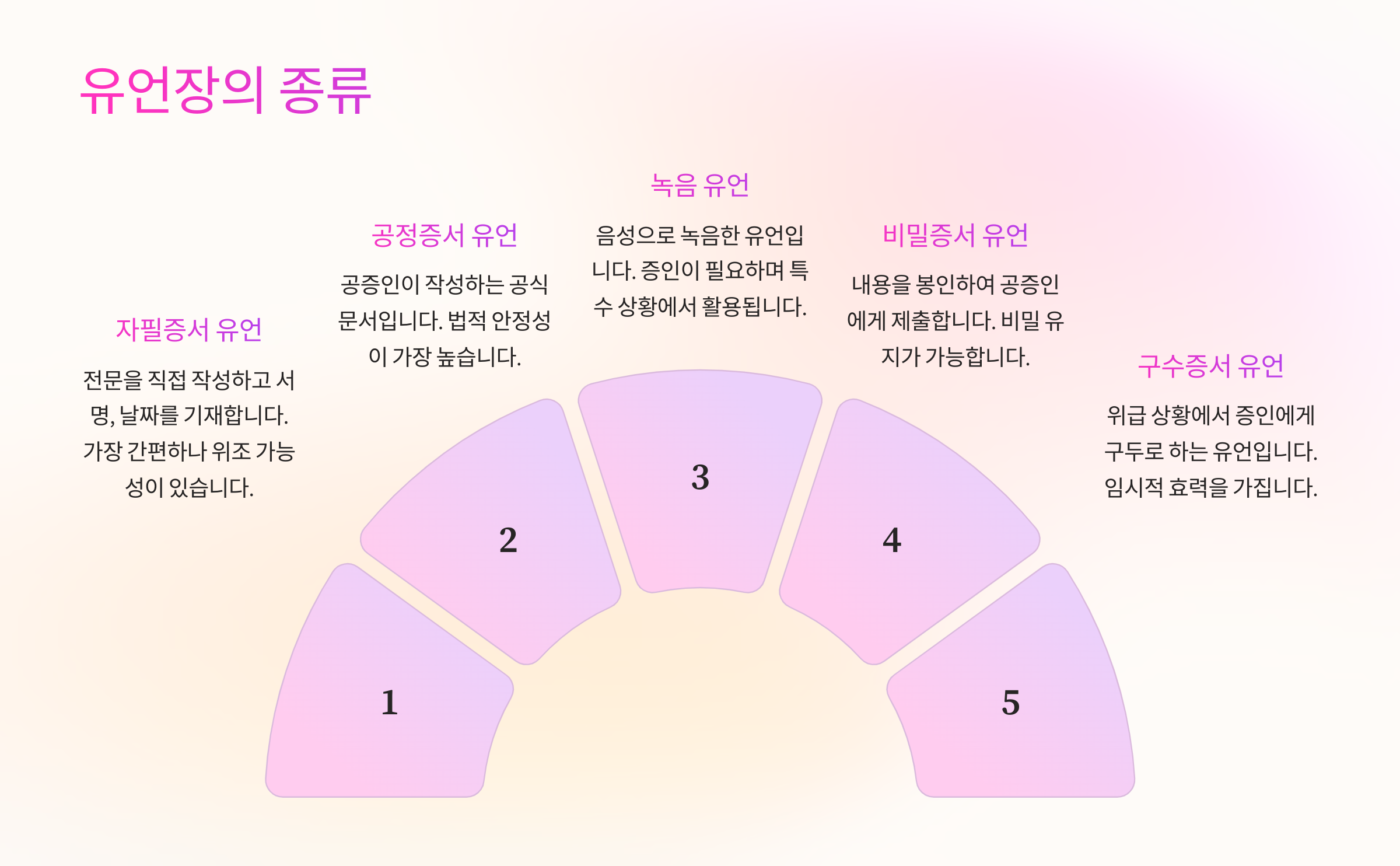 유언장은 법적으로 인정되는 다섯 가지 방식이 있어요. 각 방식에 따라 작성 방법과 법적 효력이 조금씩 달라요.