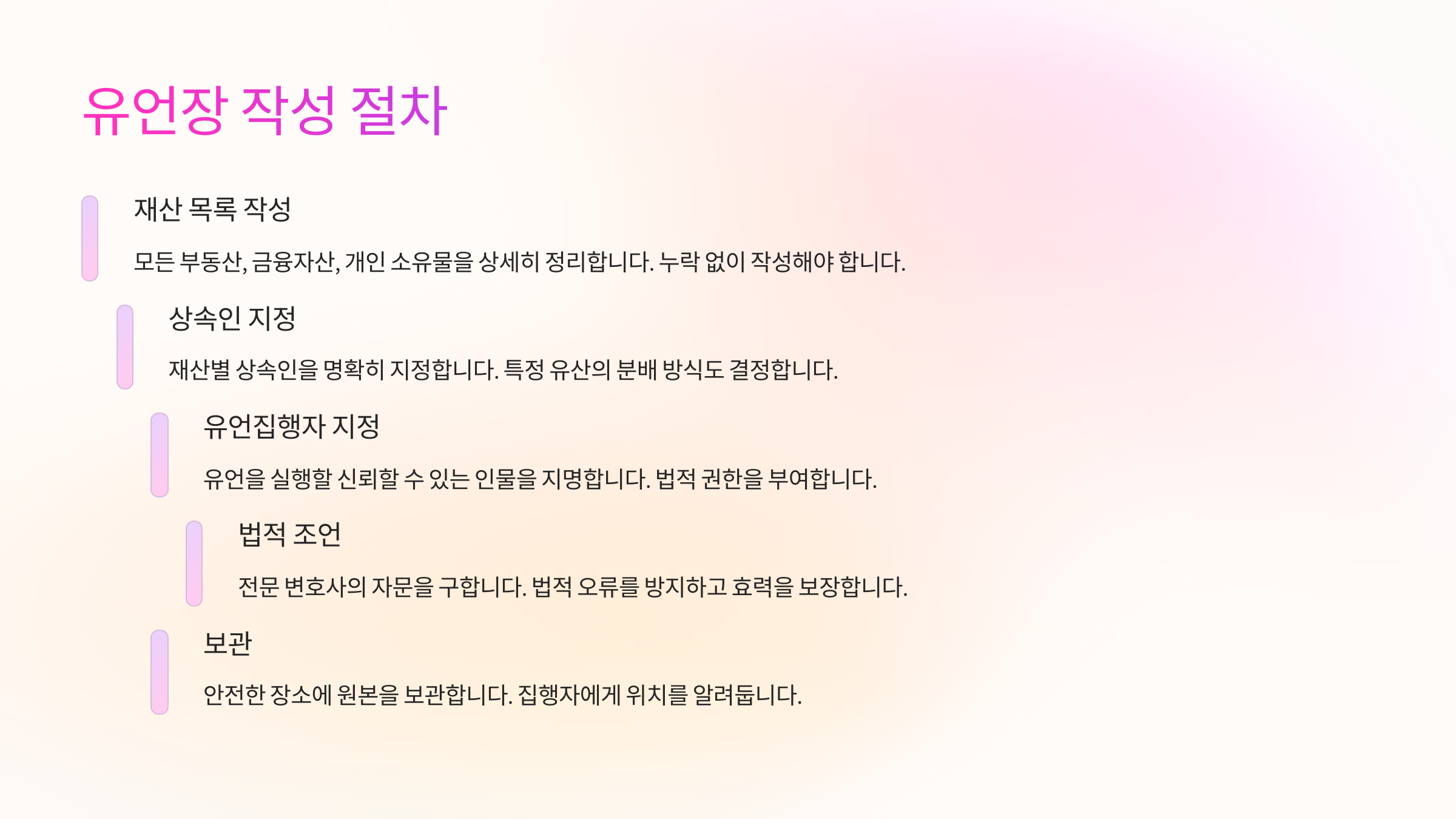 - 📌 유언 방식 선택: 자필, 공정 증서, 녹음 등 원하는 방식으로 유언장을 작성해요.