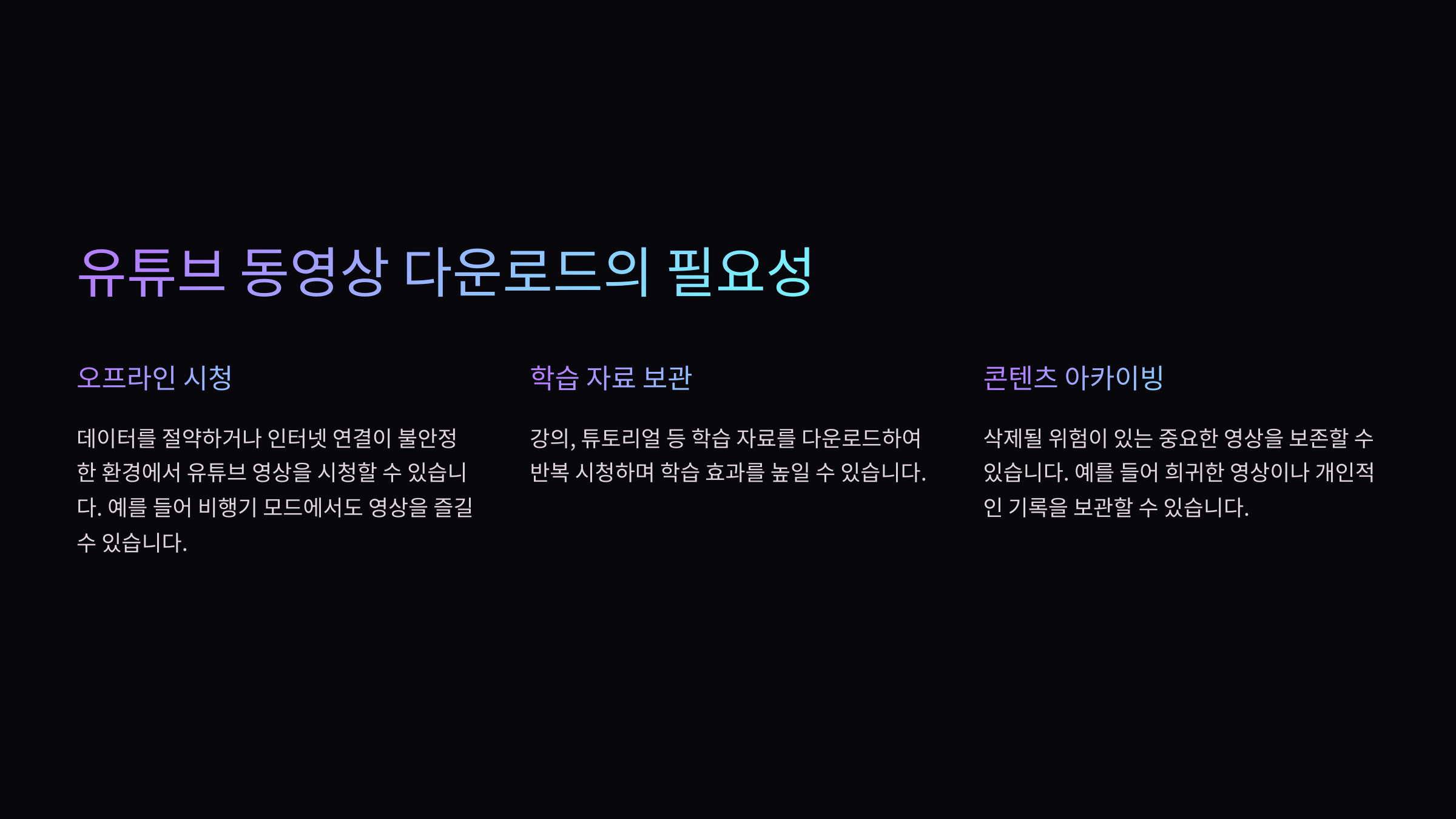 유튜브 동영상을 다운로드해야 하는 대표적인 이유는 다음과 같아요.