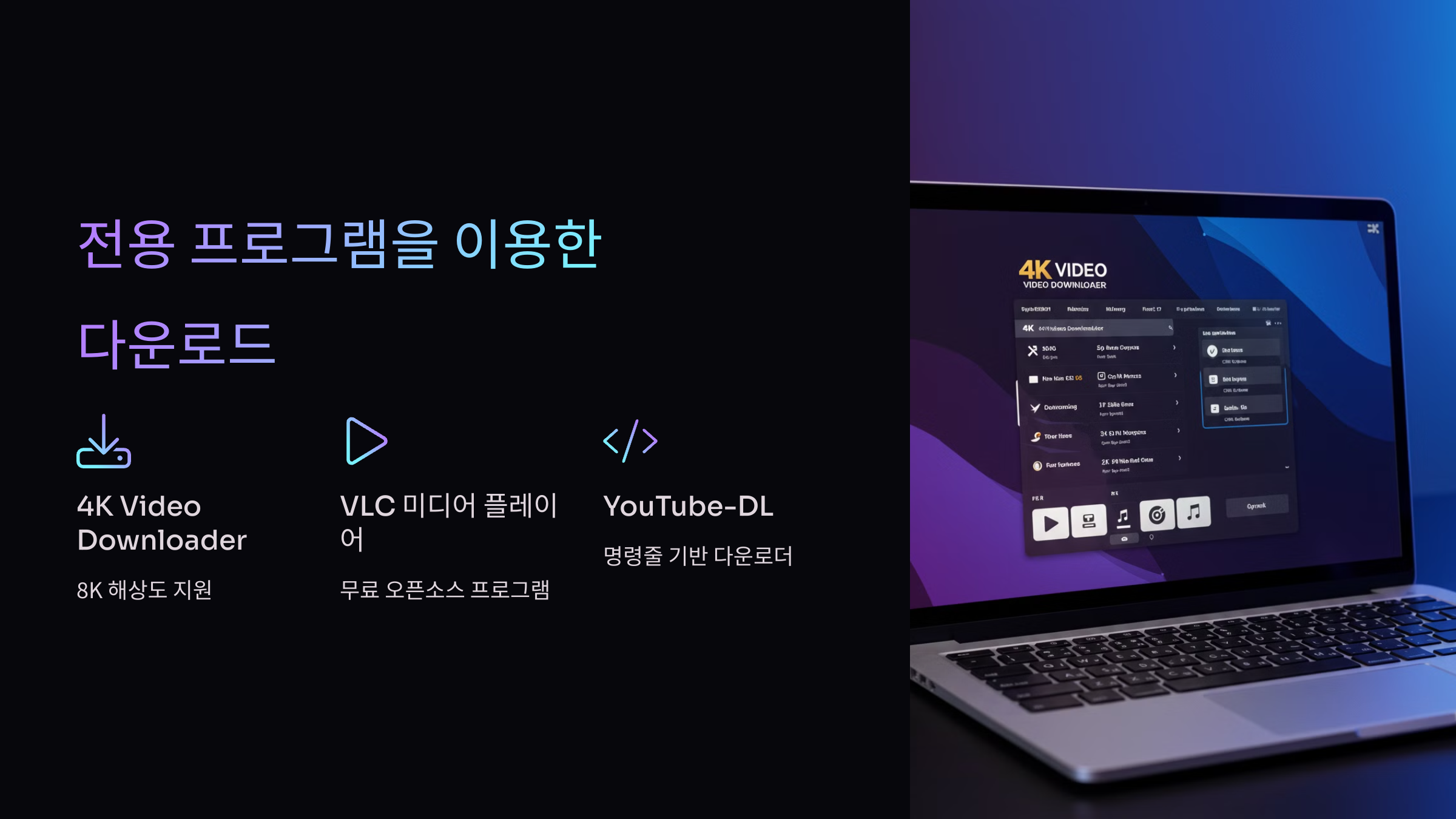 | 4K Video Downloader | 4K 해상도 지원, 자막 포함 다운로드 | MP4, MKV, MP3 | Windows, Mac |