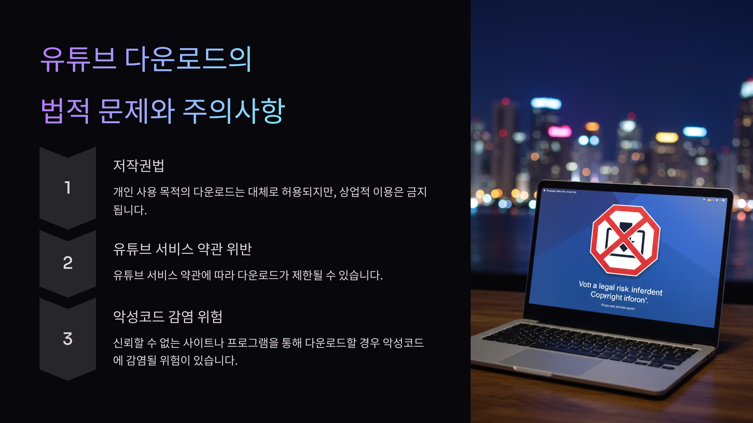 다음 섹션에서는 유튜브 영상 다운로드와 관련된 법적 문제와 주의해야 할 사항을 자세히 알아볼게요.