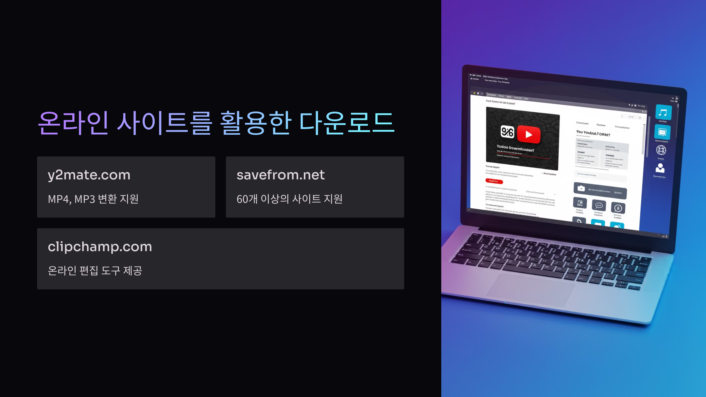| Y2Mate | 고해상도 다운로드 가능 | MP4, AVI, MP3 | 광고가 많음 |
