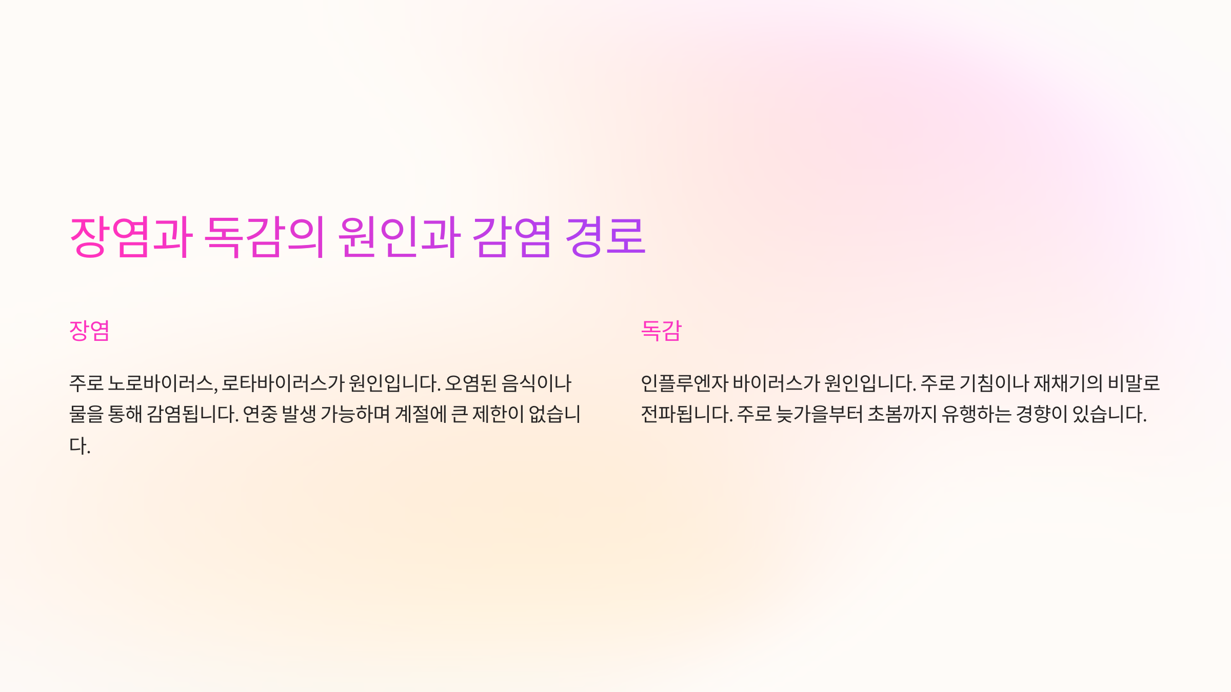 다음 섹션에서는 장염과 독감의 감염 경로와 원인을 더 자세히 알아볼게요! 🦠