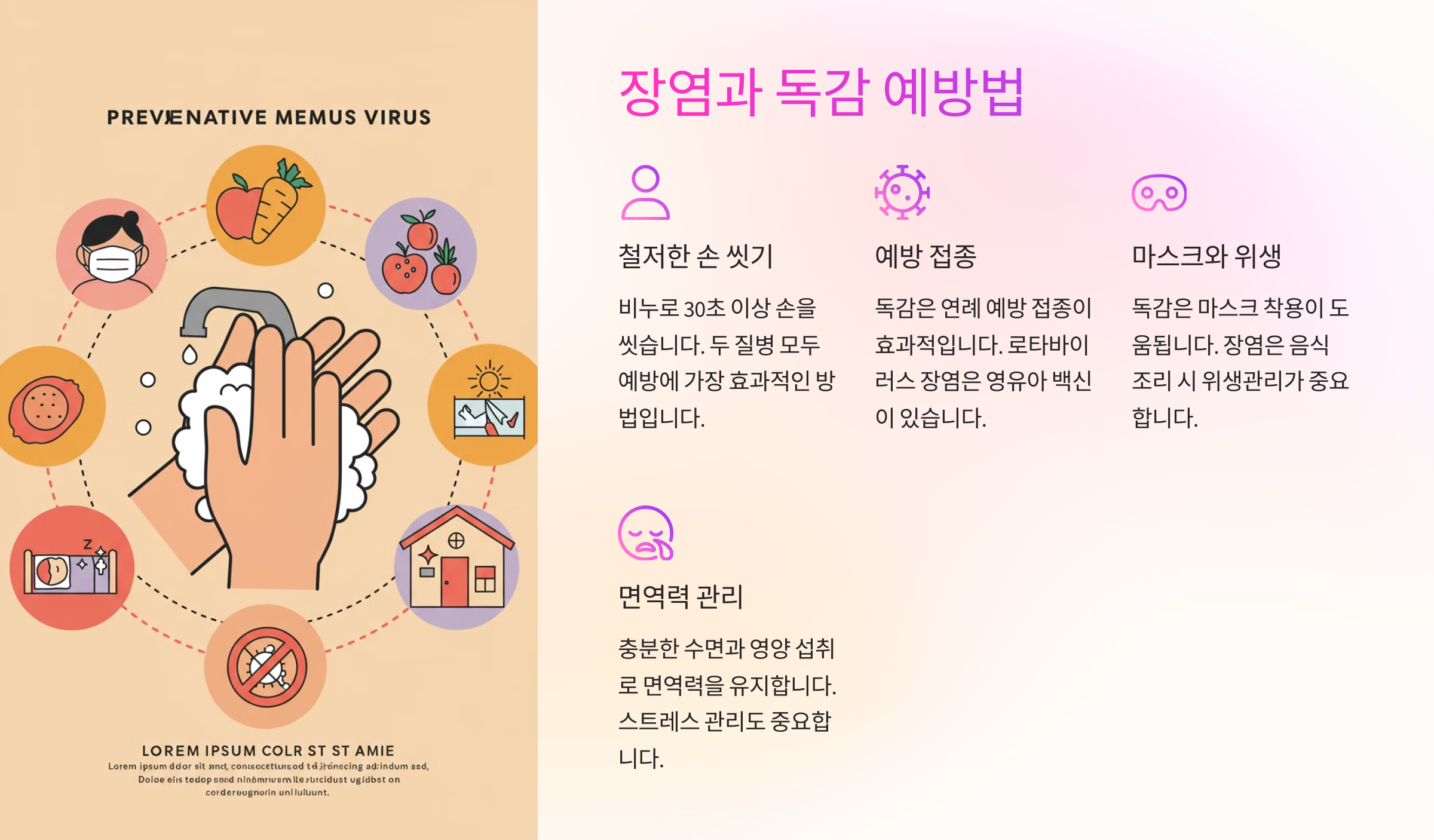 - 🚨 손 씻기는 가장 효과적인 예방법! 장염과 독감 모두 손을 통해 전염될 수 있어요.