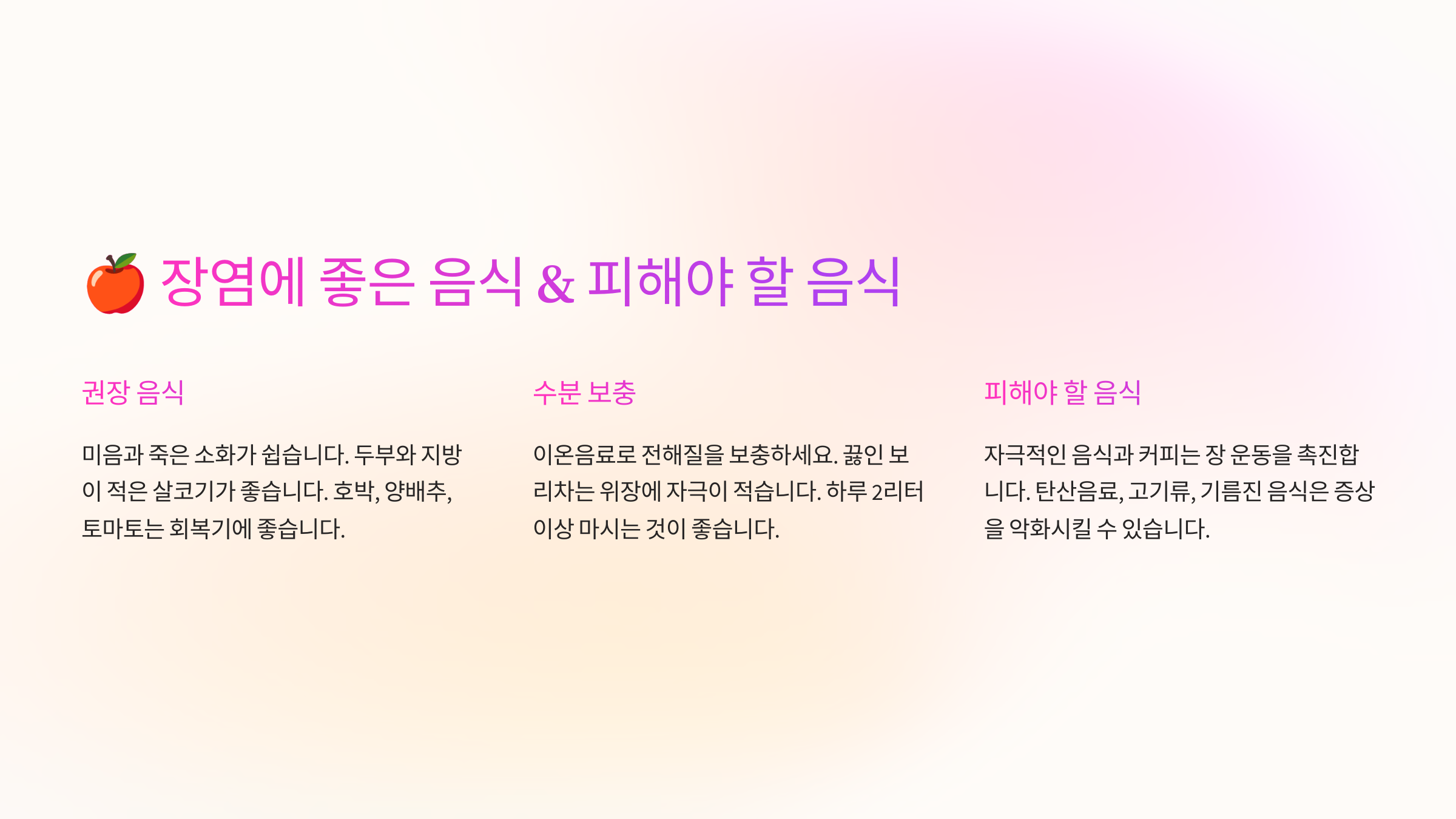 다음 섹션에서는 장염에 좋은 음식과 피해야 할 음식을 정리해볼게요! 🍎