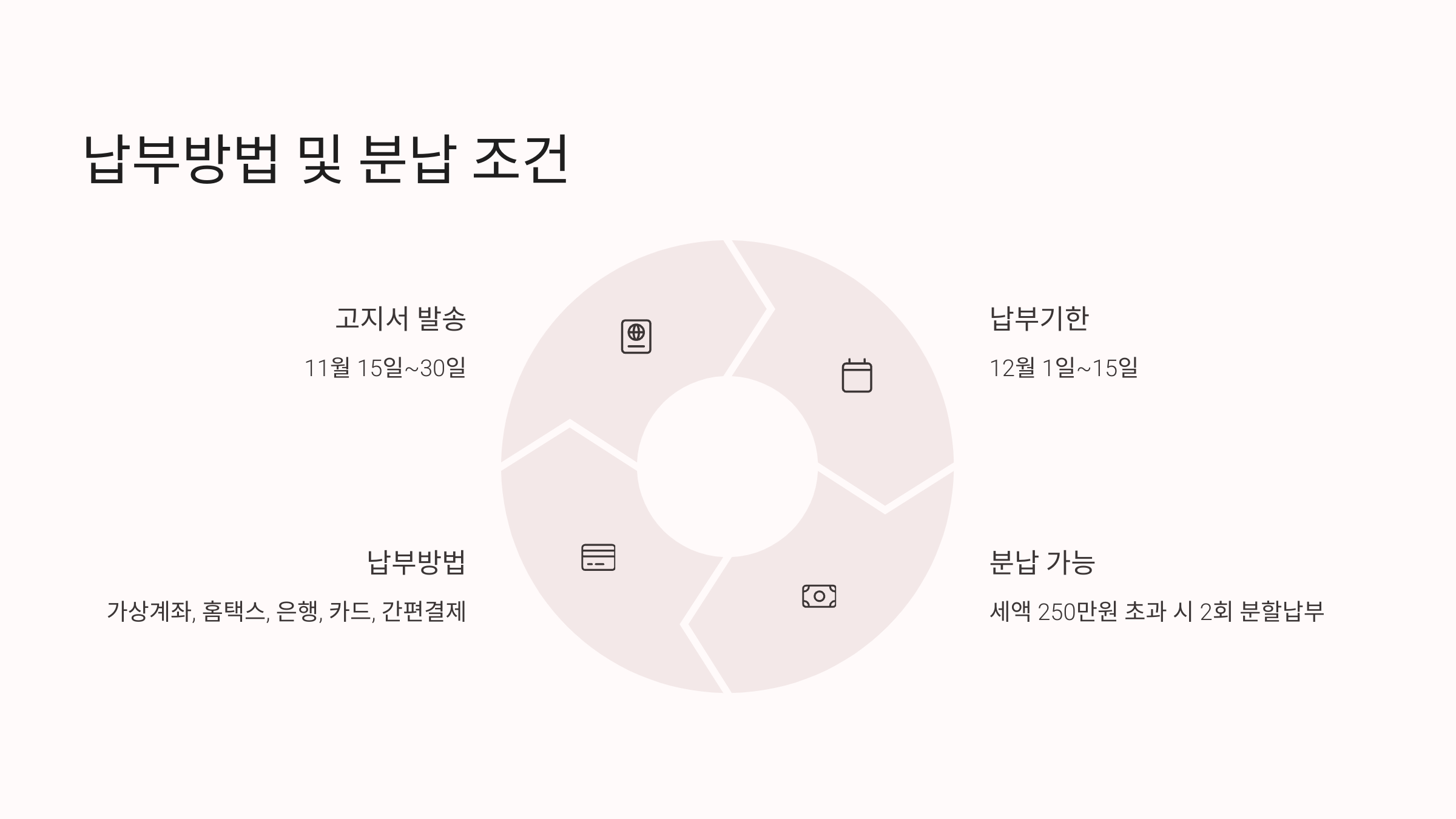 종부세는 매년 12월 1일부터 15일까지 납부해야 해요. 국세청이 고지서를 보내주며, 직접 신고해서 납부하는 것도 가능하답니다. 납부는 원칙적으로 일시납부지만, 세액이 크다면 분납도 허용돼요.