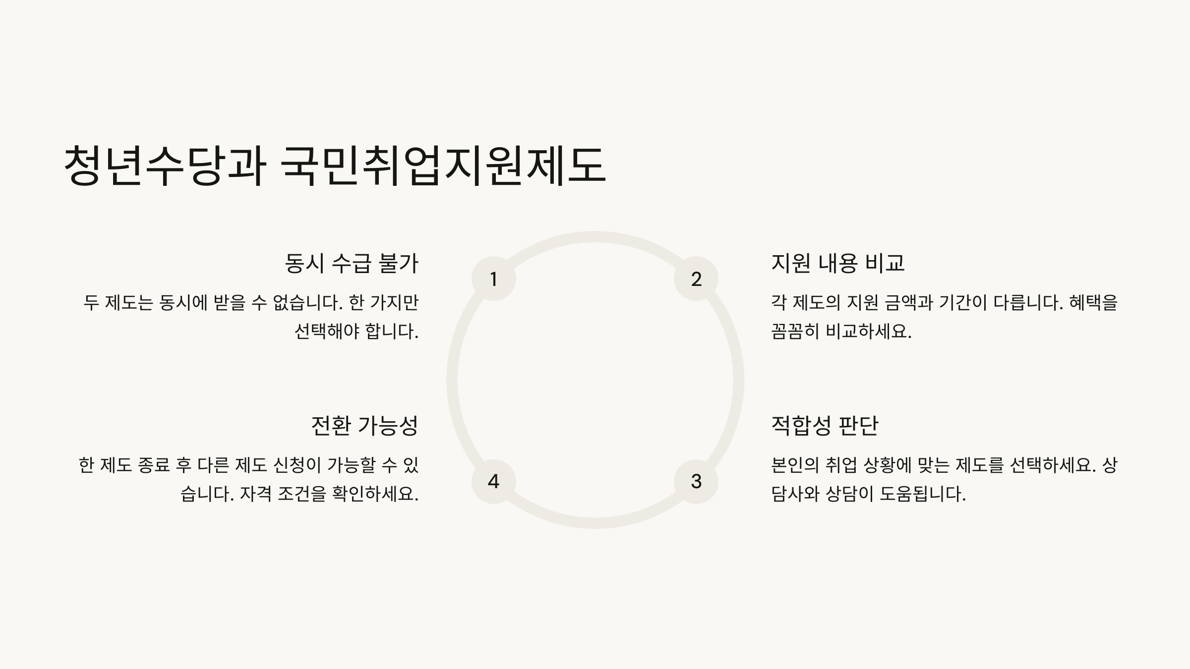 📢 왜 중복 신청이 안 될까? - 두 제도 모두 미취업자를 위한 지원금이므로 동시에 받을 수 없어요. - 국민취업지원제도를 신청하면 청년수당 지급이 중단될 가능성이 높아요.