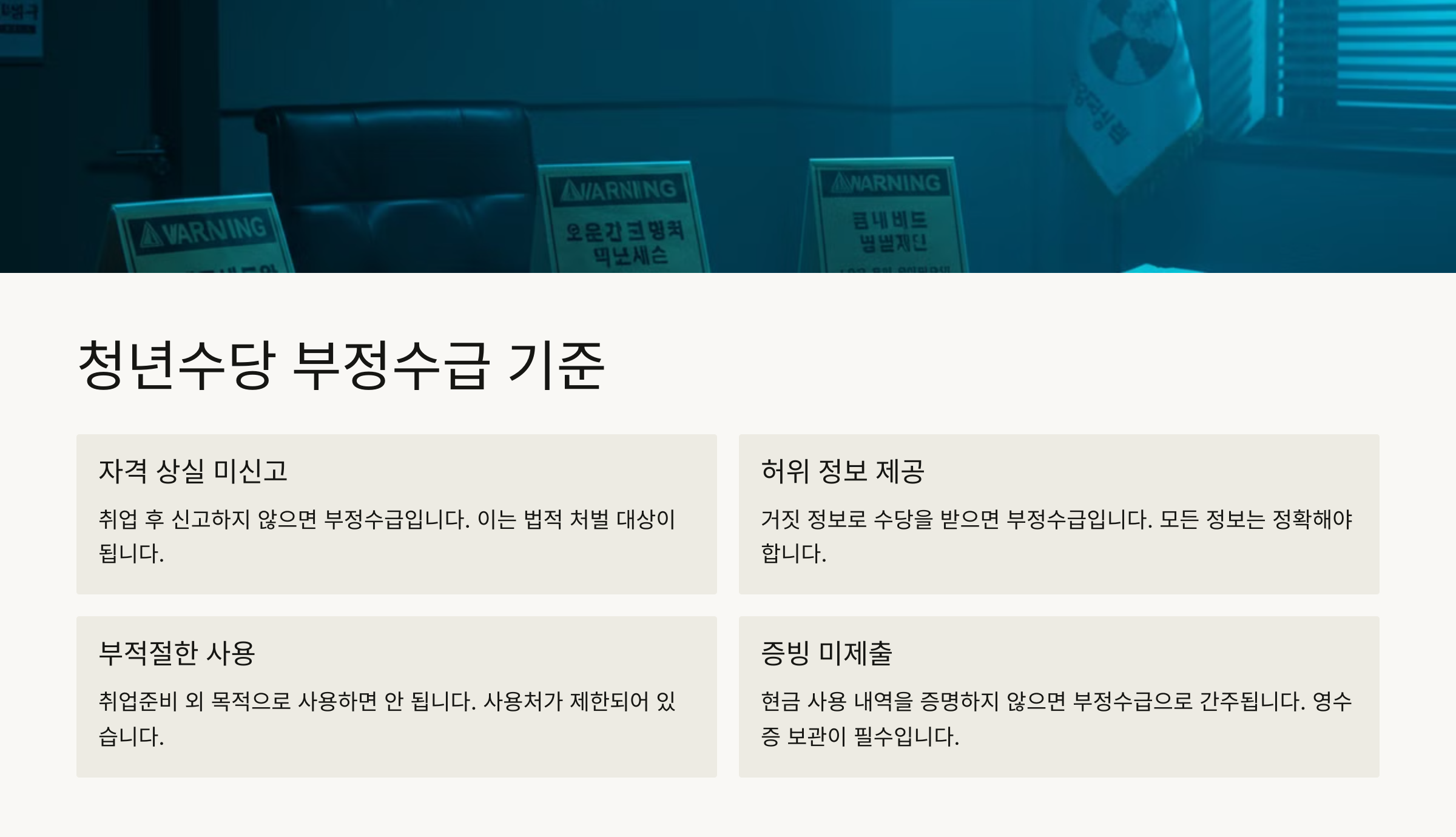 📢 부정수급 시 불이익 - 받았던 지원금을 전액 환수! - 최대 5년간 청년 지원금 신청 제한! - 법적 책임까지 물어질 수 있음!