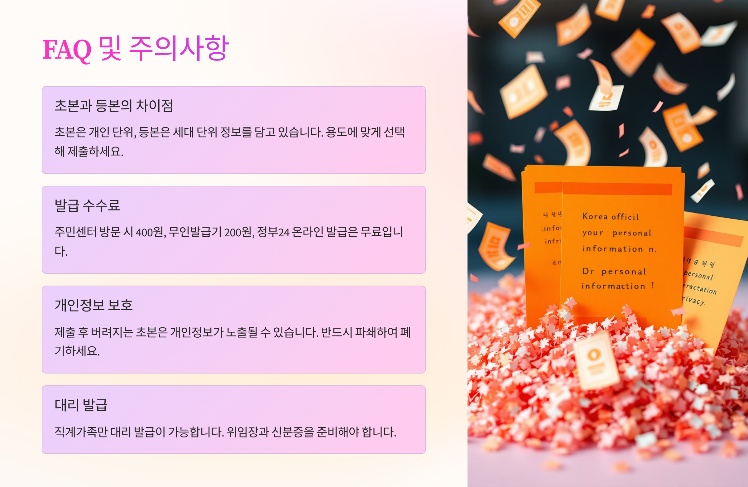 또 하나 중요한 꿀팁은, 정부24에서 한 번에 여러 문서를 신청하면 시간이 단축돼요. 예를 들어 초본과 가족관계증명서, 기본증명서를 한 번에 신청하고 PDF로 저장하면 나중에 파일 찾을 때도 훨씬 편하죠. 게다가 전자문서로 받으면 모두 무료예요. 💡