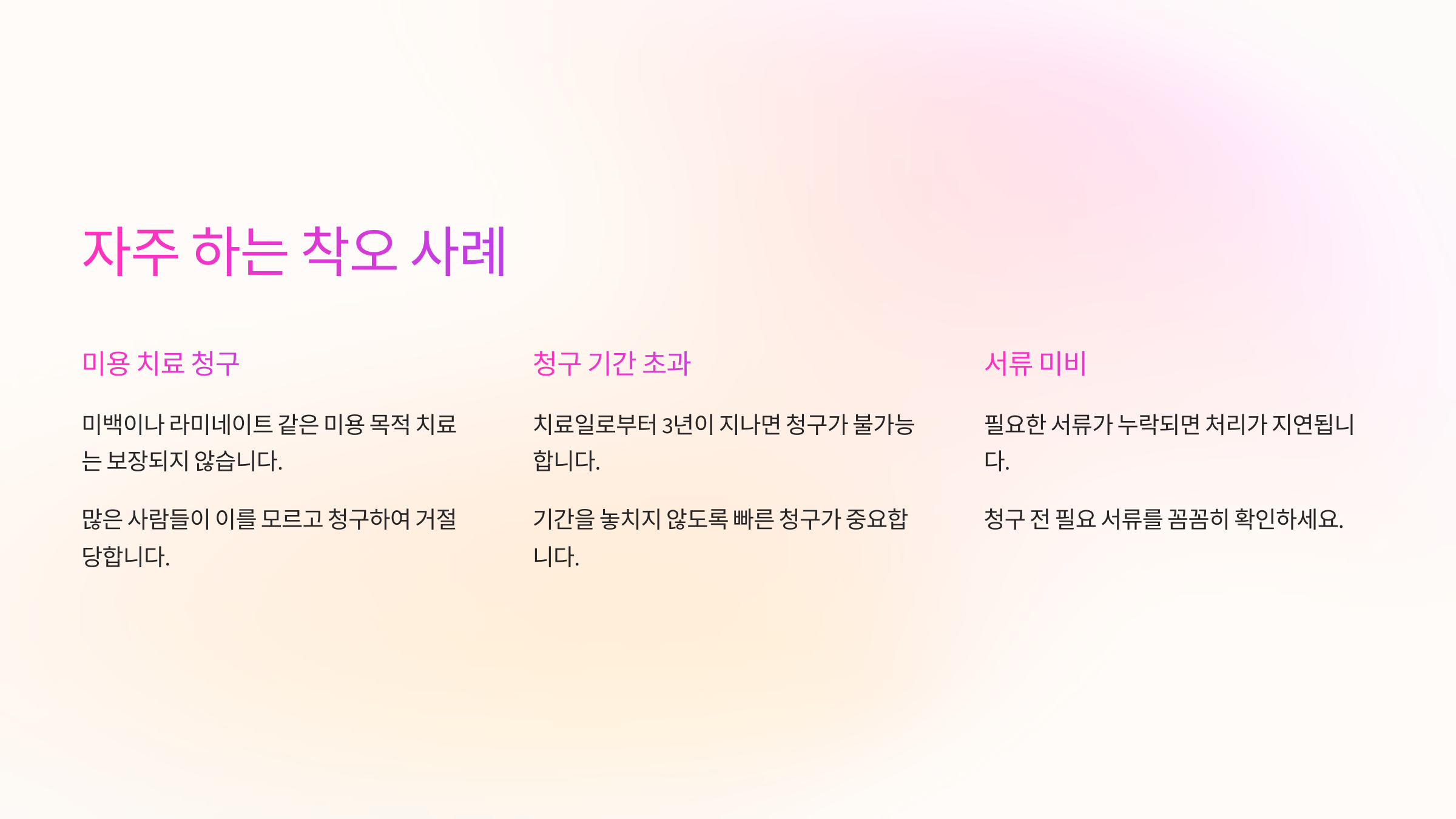 ✔ 보험사별 적용 범위 혼동 보험사마다 약관이 조금씩 다르기 때문에, 타인의 경험만 믿고 동일하게 청구하는 건 위험해요. 꼭 본인의 약관을 확인해야 해요.