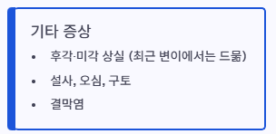 - [ ] 후각·미각 상실 (최근 변이에서는 드묾)