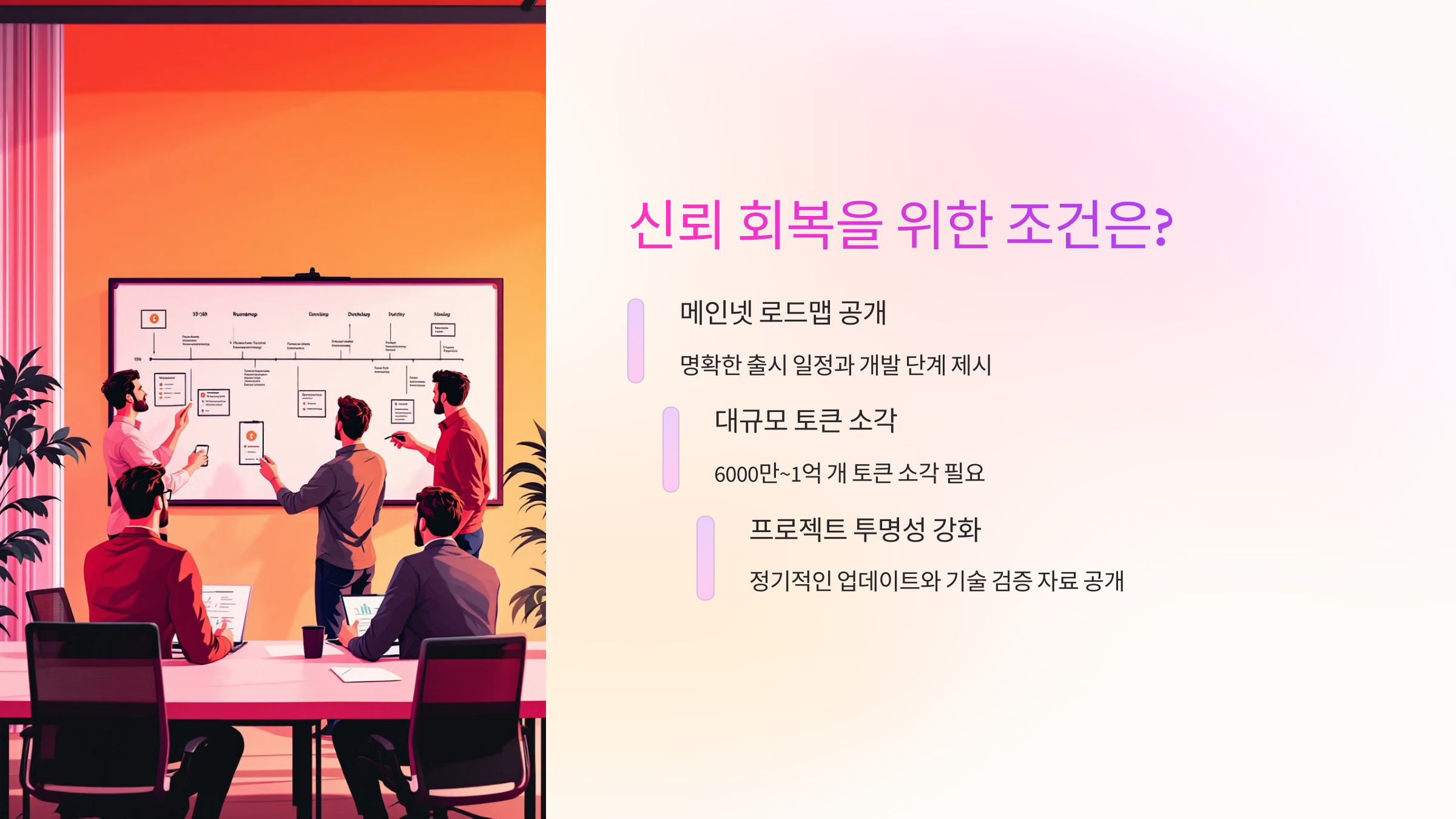 결국 이런 신뢰 하락은 단기적인 가격 반등으로는 회복되기 어려운 문제예요. 기술과 시장, 커뮤니케이션 모두에서 다시 신뢰를 쌓는 과정이 필요하다는 뜻이에요. 지금 이 시점은 단순한 ‘시세 조정기’가 아닌, 신뢰 리빌딩이 필요한 진짜 전환점일지도 몰라요.