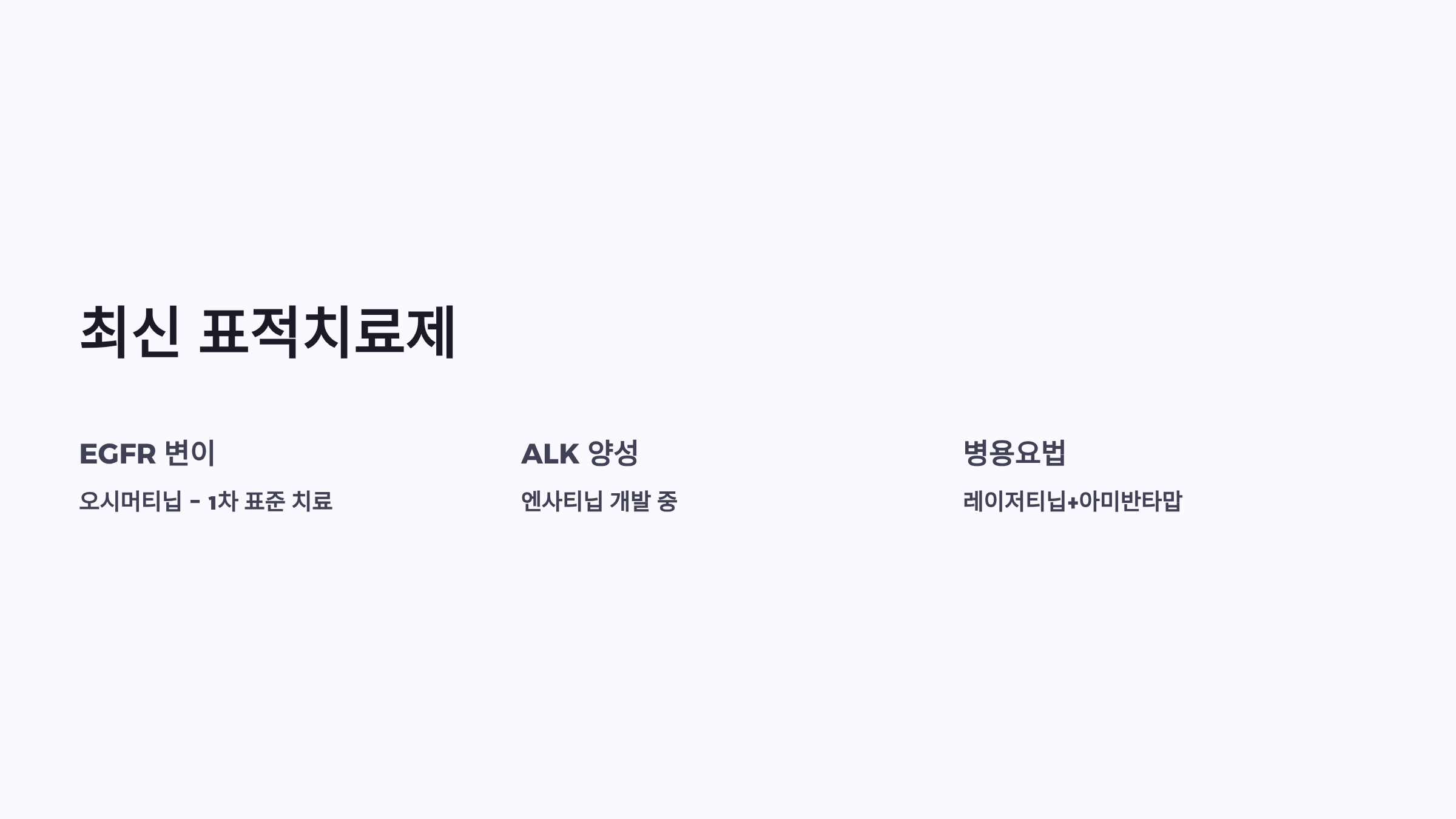 | 표적치료 | EGFR, ALK, ROS1 변이 | 오시머티닙, 엔사티닙 |
