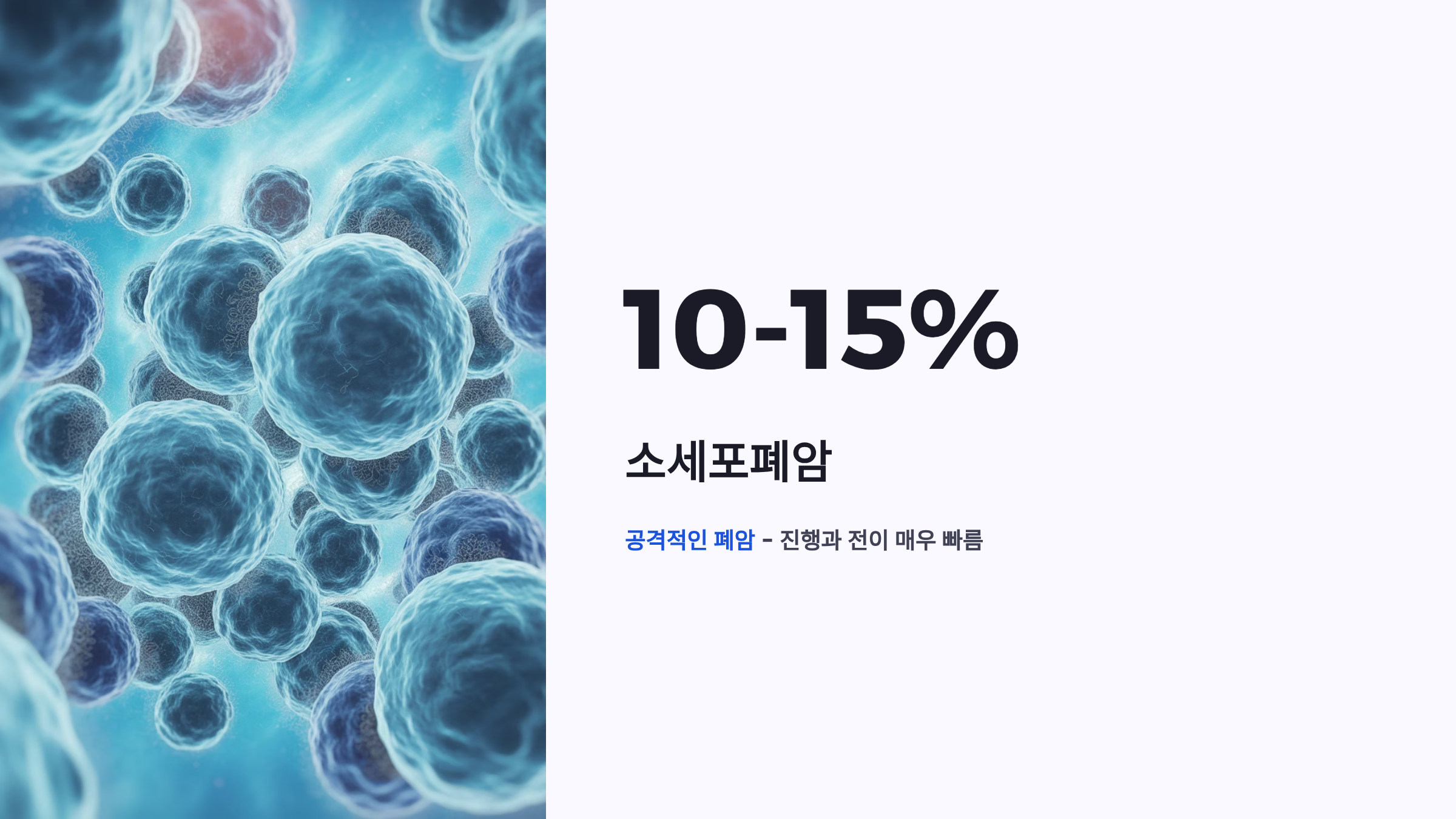 소세포폐암(SCLC)은 전체 폐암의 약 10~15%를 차지하며, 흡연과 매우 밀접한 관련이 있습니다. 비소세포폐암에 비해 진행과 전이가 매우 빠르고 악성도가 높아 '공격적인 폐암'으로 불립니다.