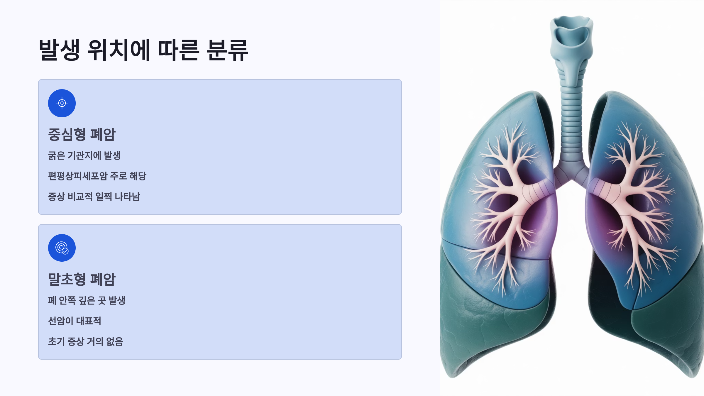 폐암은 크게 비소세포폐암(85%)과 소세포폐암(10~15%)으로 나뉘며, 비소세포폐암은 다시 선암, 편평상피세포암, 대세포암으로 세분화됩니다. 선암은 유전자 변이가 흔해 표적치료제 효과가 높고, 소세포폐암은 진행이 빠르지만 항암화학요법에 초기 반응이 좋습니다.