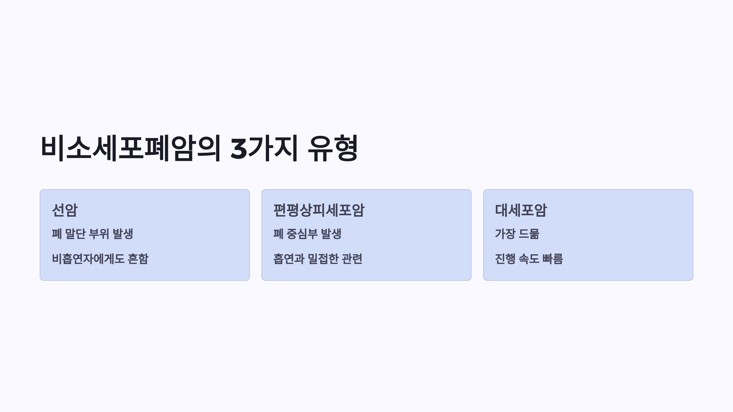 | 발생 위치 | 폐 말단 부위 | 폐 중심부(기관지) |