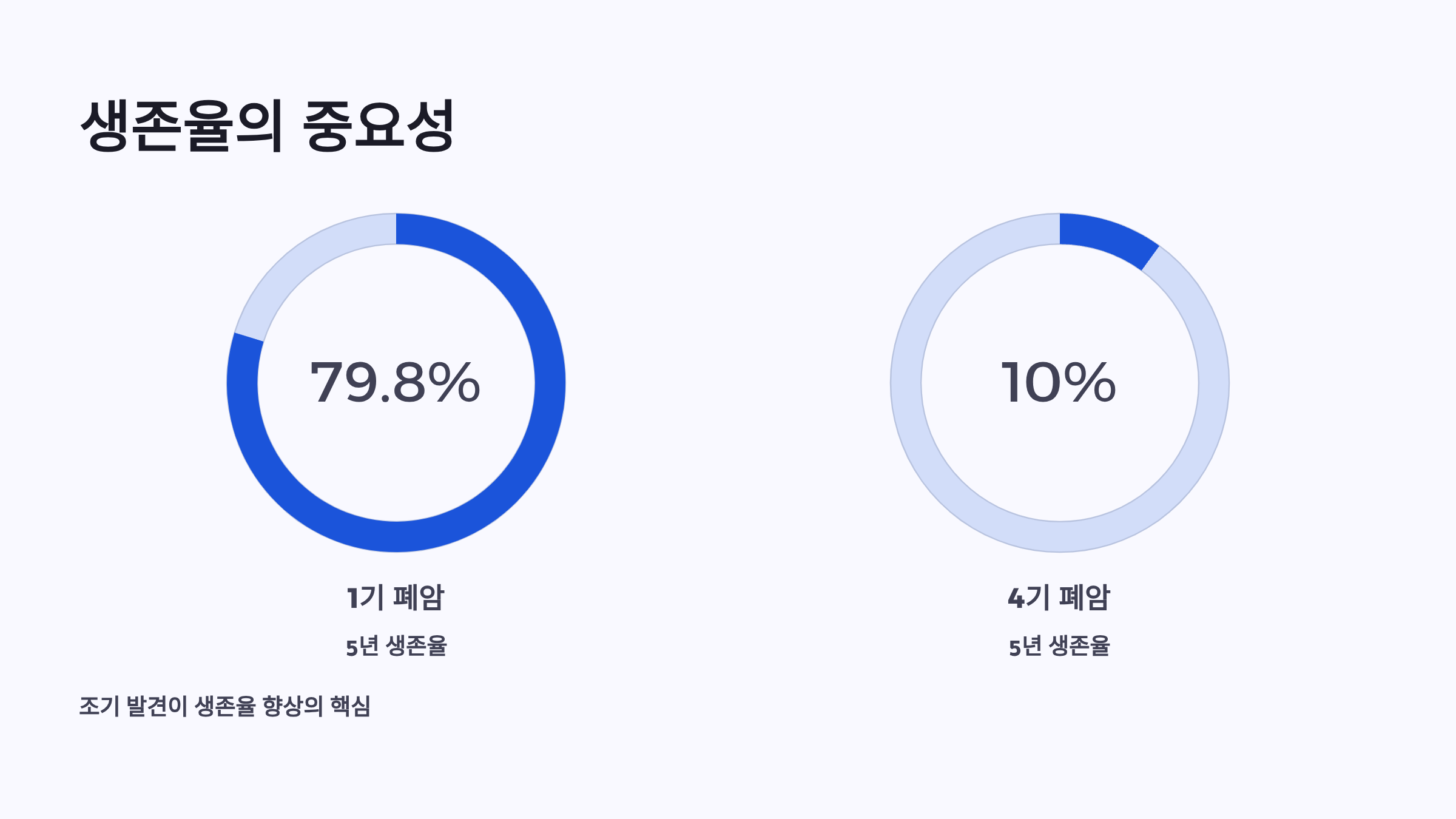 조기 폐암(1기)의 5년 생존율은 79.8%에 달하지만, 진행된 폐암(4기)은 10% 내외로 크게 낮아지므로 정기 검진을 통한 조기 발견이 무엇보다 중요합니다. 금연과 위험 요인 관리, 그리고 고위험군의 저선량 흉부 CT 정기 검진이 생존율 향상의 핵심입니다.