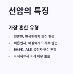 선암(Adenocarcinoma)은 비소세포폐암 중 가장 흔한 유형으로, 특히 일본인과 한국인에게 많이 발생합니다. 폐의 말단 부위에 주로 생기며, 비흡연자나 여성에게서도 자주 발견되는 특징이 있습니다.