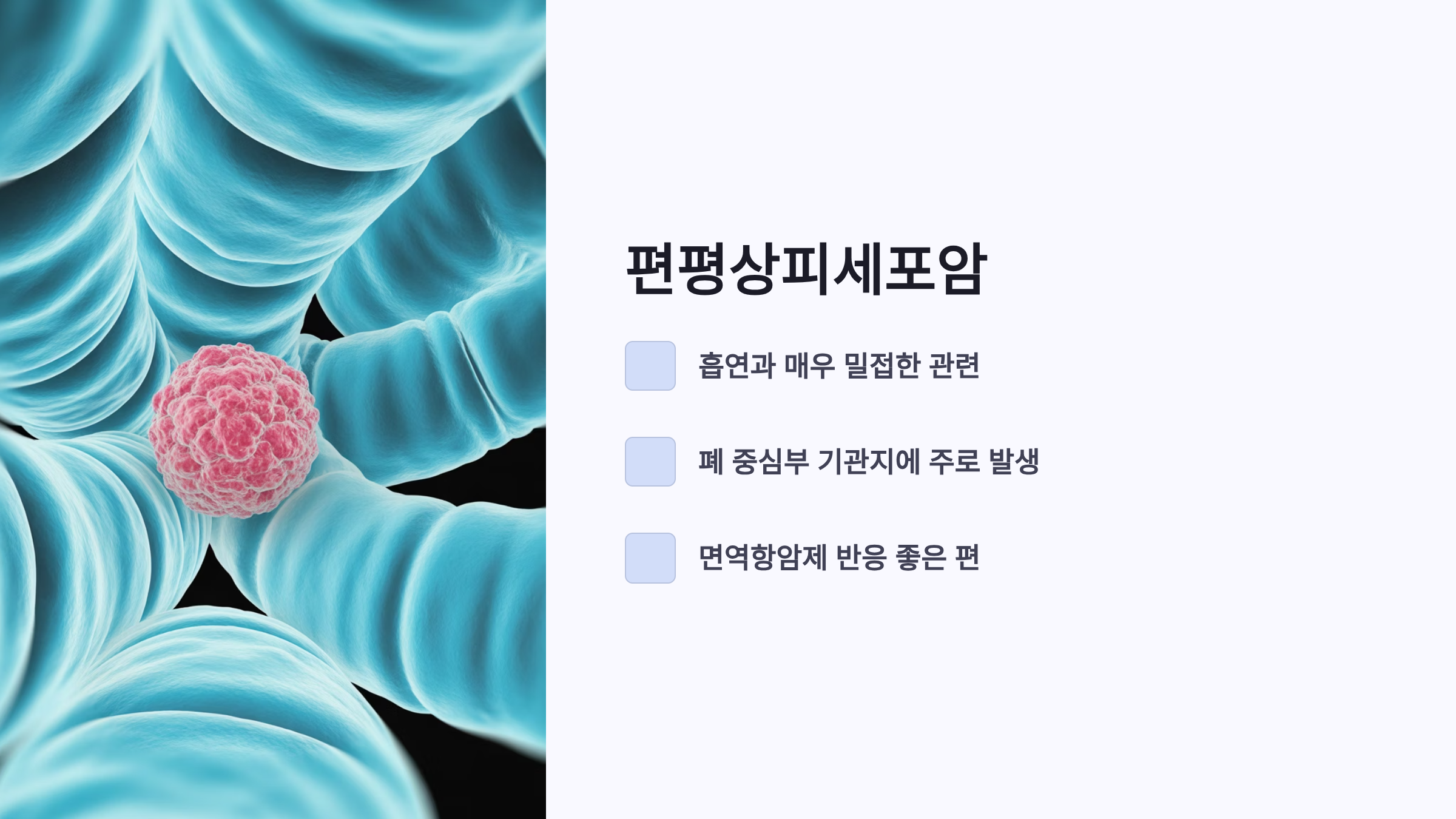 편평상피세포암(Squamous cell carcinoma)은 흡연과 매우 밀접한 관련이 있으며, 폐의 중심부인 기관지에 주로 발생합니다. 선암에 비해 유전자 변이가 적어 표적치료제의 효과는 제한적이지만, 면역항암제에 대한 반응은 좋은 편입니다.