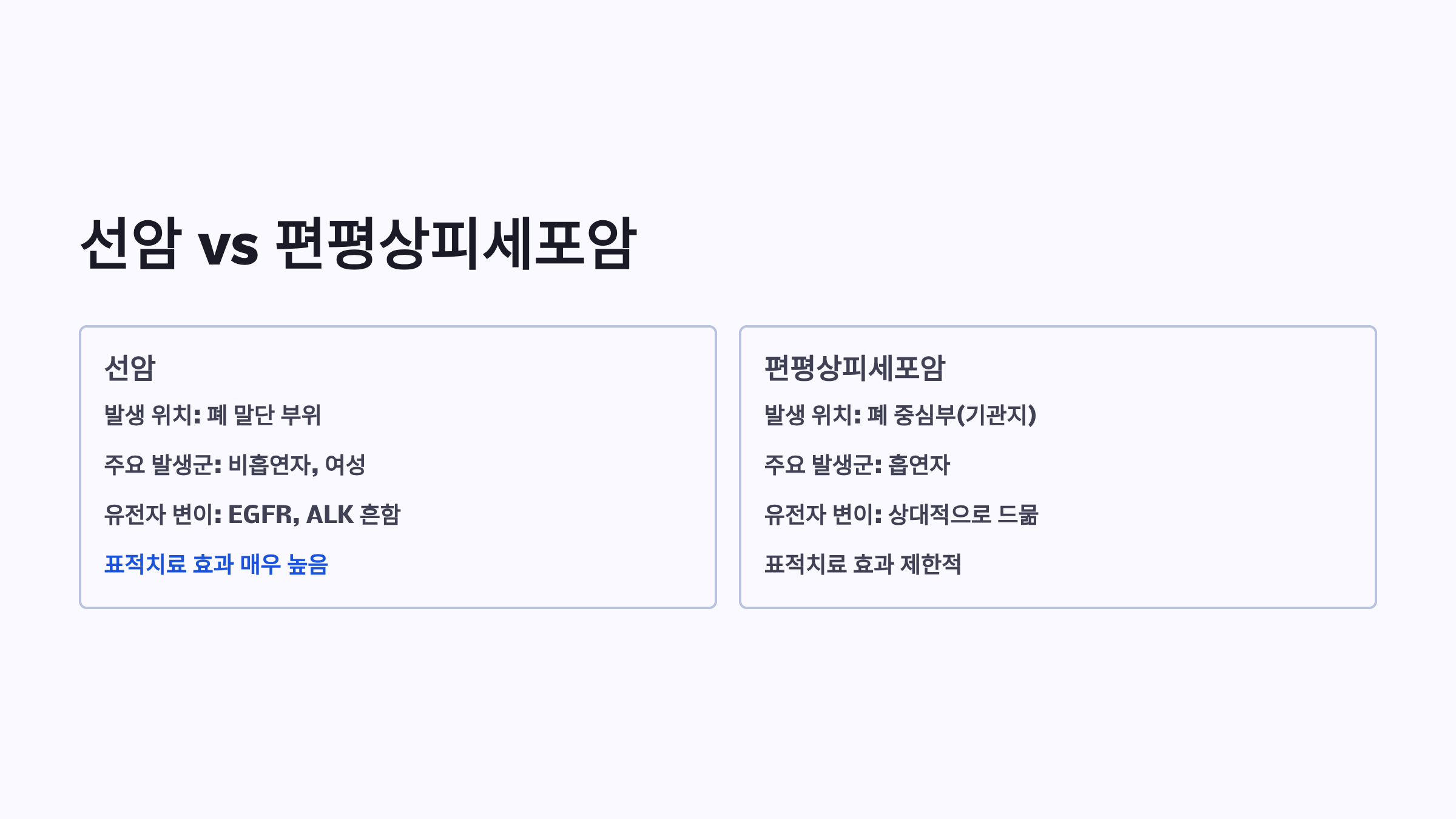 | 유전자 변이 | EGFR, ALK 흔함 | 상대적으로 드묾 |
