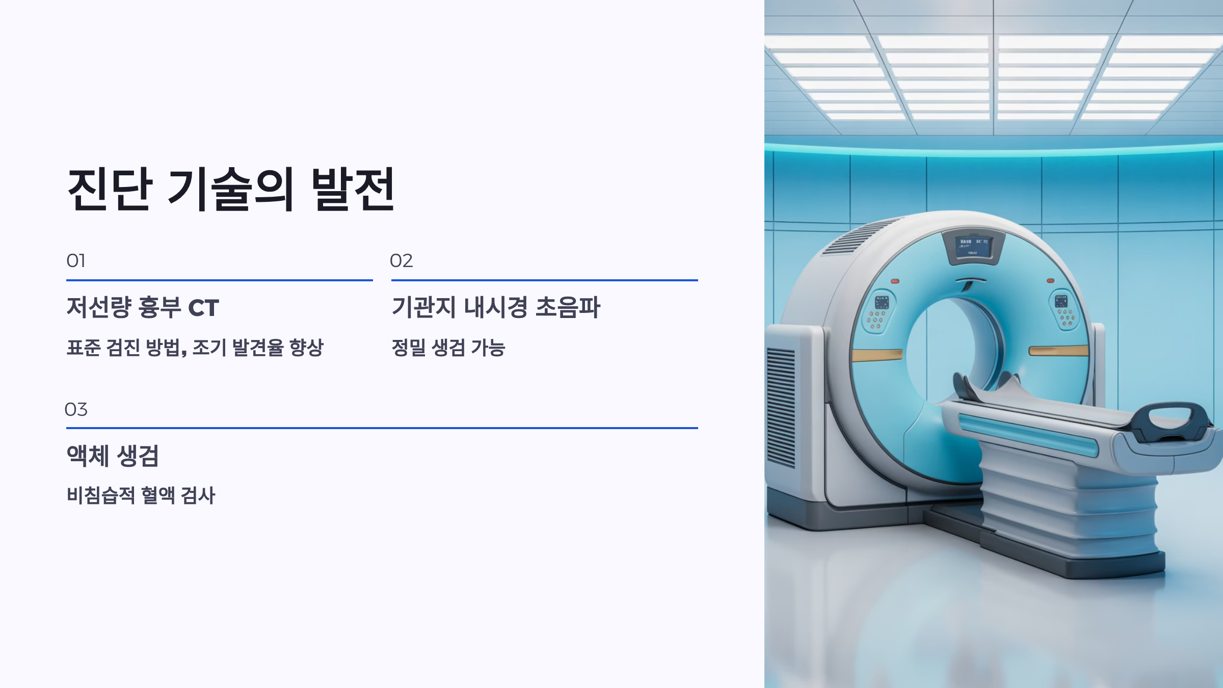 폐암 진단 기술은 저선량 흉부 CT가 표준 검진 방법으로 자리잡으면서 조기 발견율이 크게 향상되었습니다. 기관지 내시경 초음파(EBUS)를 활용한 정밀 생검과 액체 생검(Liquid Biopsy)을 통한 혈액 검사는 비침습적 진단의 새로운 가능성을 열고 있습니다. 치료 분야에서는 표적치료제와 면역항암제의 발전이 눈부십니다.