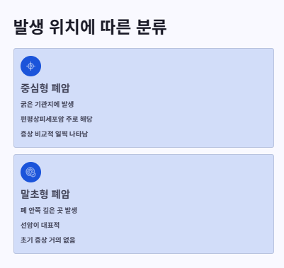 | 발생 위치 | 폐 말단 부위 | 폐 중심부(기관지) |