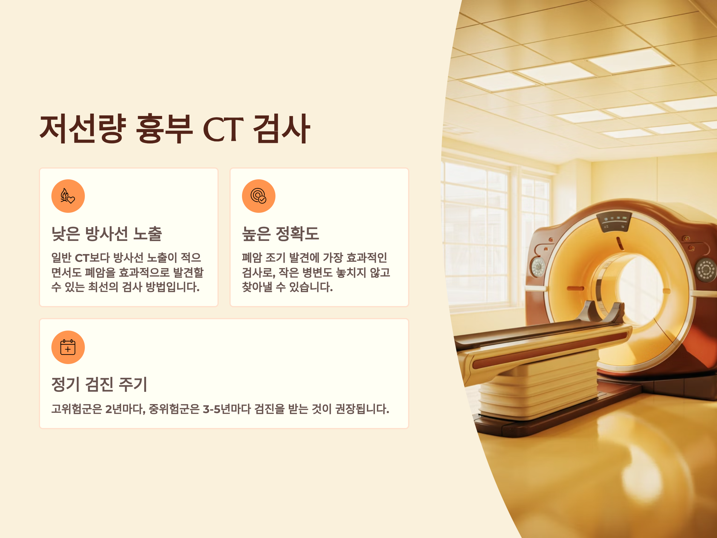 폐암은 초기 발견 시 5년 생존율이 80%에 달하지만, 진행 후 발견하면 40% 수준으로 떨어집니다. 따라서 증상이 없더라도 고위험군은 정기적인 검진이 필수입니다. 저선량 흉부 CT는 일반 CT보다 방사선 노출이 적으면서도 폐암을 효과적으로 발견할 수 있는 최선의 검사 방법입니다.