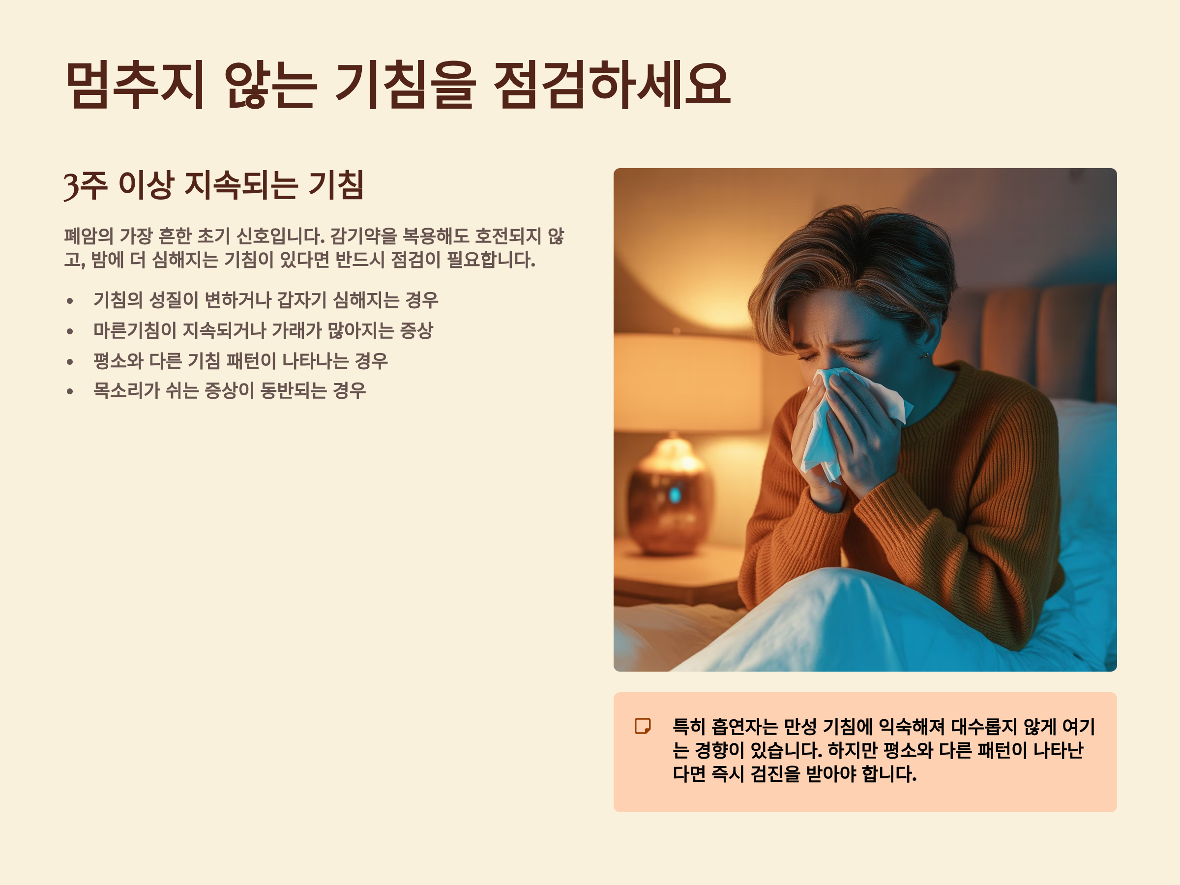 폐암 초기증상 점검은 3주 이상 지속되는 기침, 피 섞인 가래, 호흡곤란, 가슴 통증, 원인 모를 체중 감소를 중심으로 이루어져야 합니다. 이 중 하나라도 해당된다면 즉시 의료기관을 방문하여 저선량 흉부 CT 검사를 받아야 합니다.