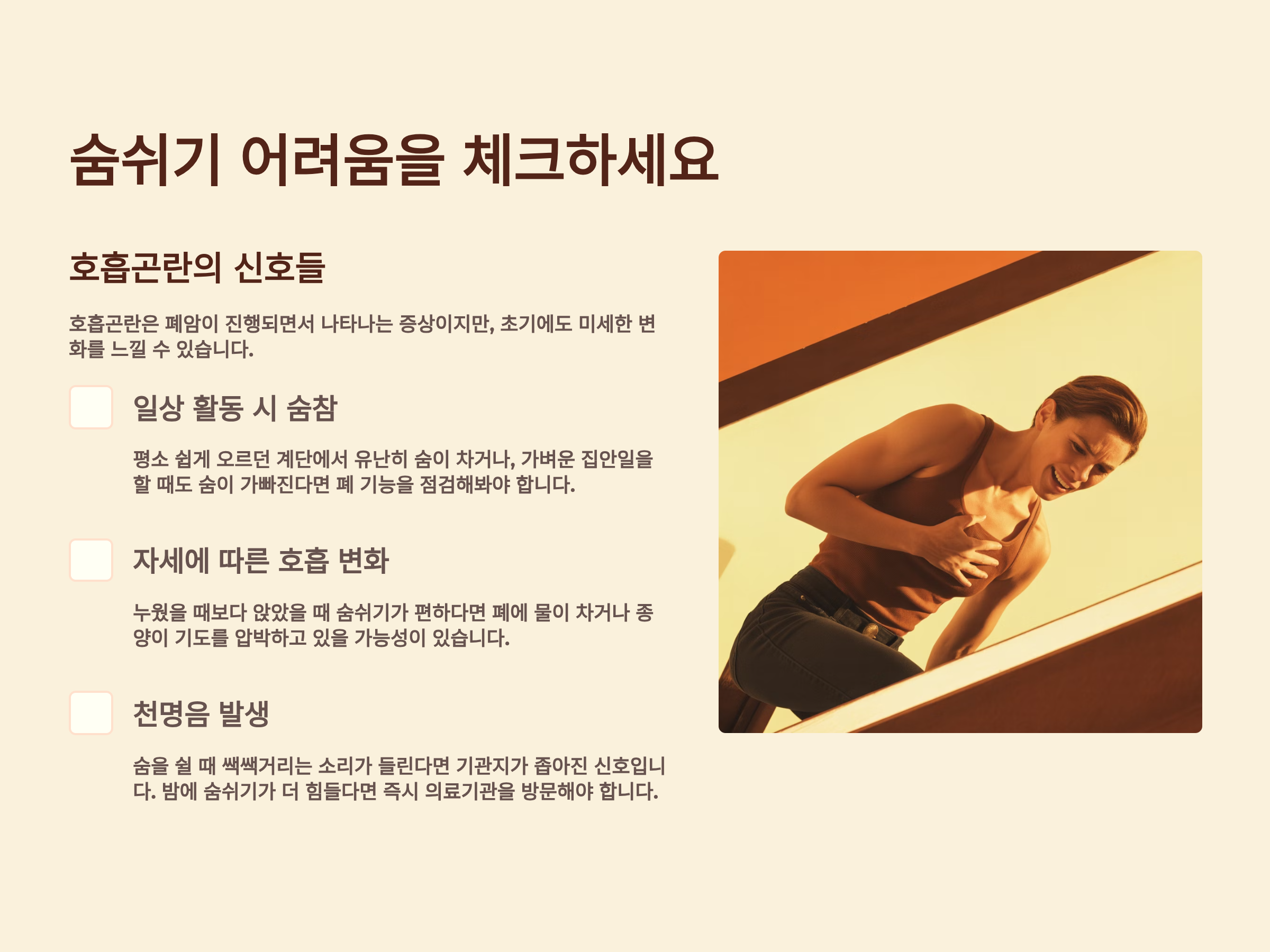 호흡곤란은 폐암이 진행되면서 나타나는 증상이지만, 초기에도 미세한 변화를 느낄 수 있습니다. 평소 쉽게 오르던 계단에서 유난히 숨이 차거나, 가벼운 집안일을 할 때도 숨이 가빠진다면 폐 기능을 점검해봐야 합니다. 누웠을 때보다 앉았을 때 숨쉬기가 편하다면 폐에 물이 차거나 종양이 기도를 압박하고 있을 가능성이 있습니다.