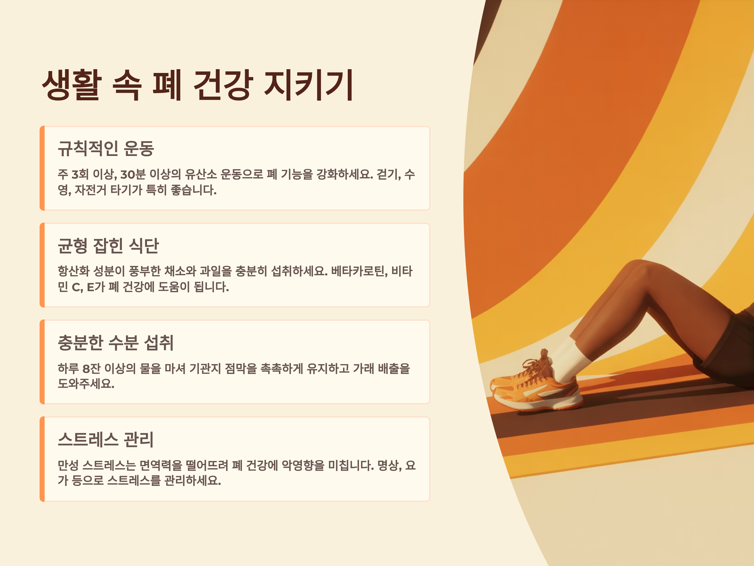 숨을 쉴 때 쌕쌕거리는 천명음이 들린다면 기관지가 좁아진 신호입니다. 밤에 숨쉬기가 더 힘들거나 갑자기 숨이 막히는 느낌이 든다면 즉시 의료기관을 방문해야 합니다. 운동 능력이 예전보다 떨어졌다고 느껴진다면 이것도 폐 기능 저하의 신호일 수 있습니다.