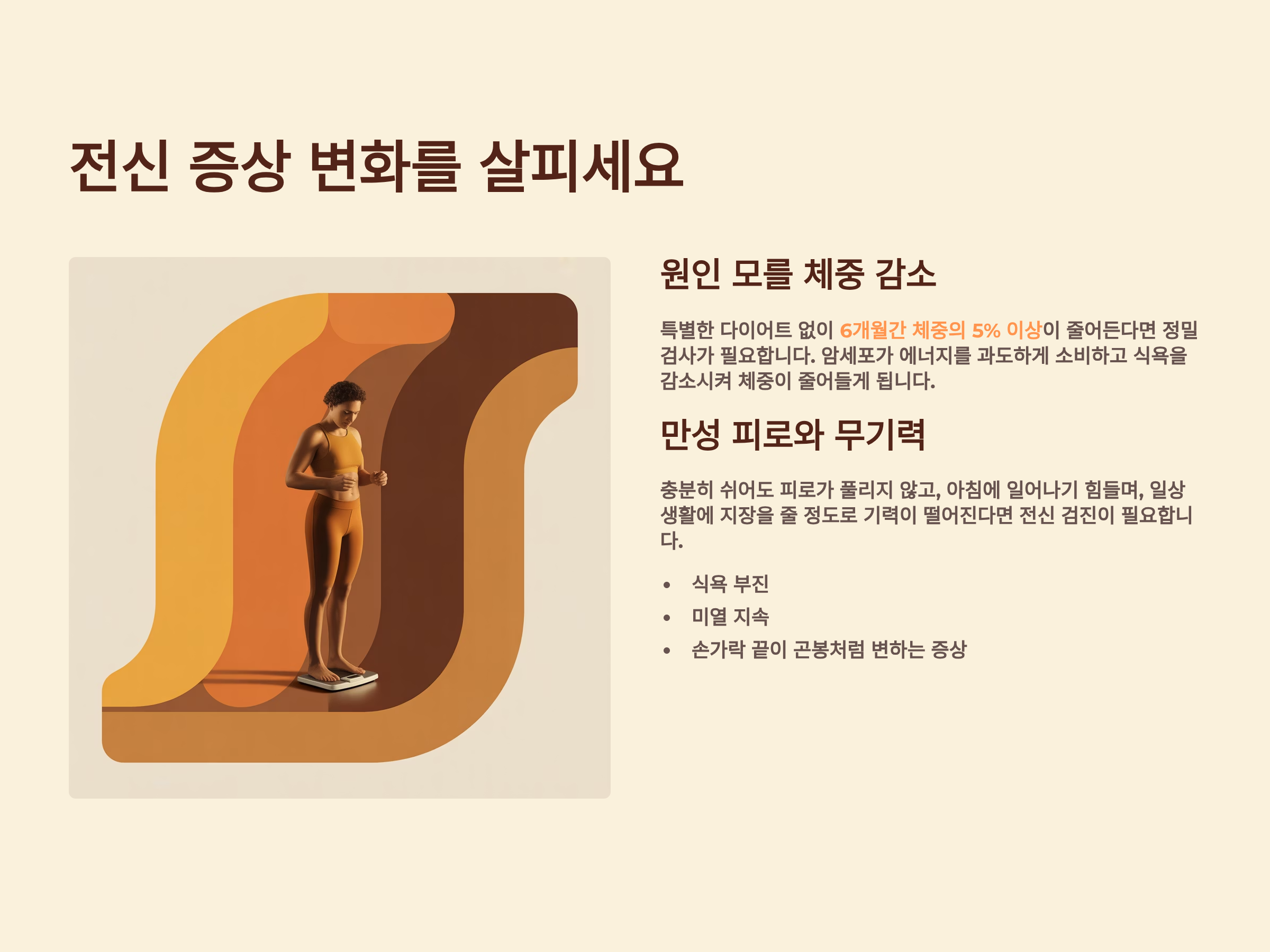 만성 피로감과 무기력증도 함께 점검해야 할 증상입니다. 충분히 쉬어도 피로가 풀리지 않고, 아침에 일어나기 힘들며, 일상생활에 지장을 줄 정도로 기력이 떨어진다면 전신 검진이 필요합니다. 식욕 부진, 미열, 손가락 끝이 곤봉처럼 변하는 증상도 폐암의 신호일 수 있습니다.