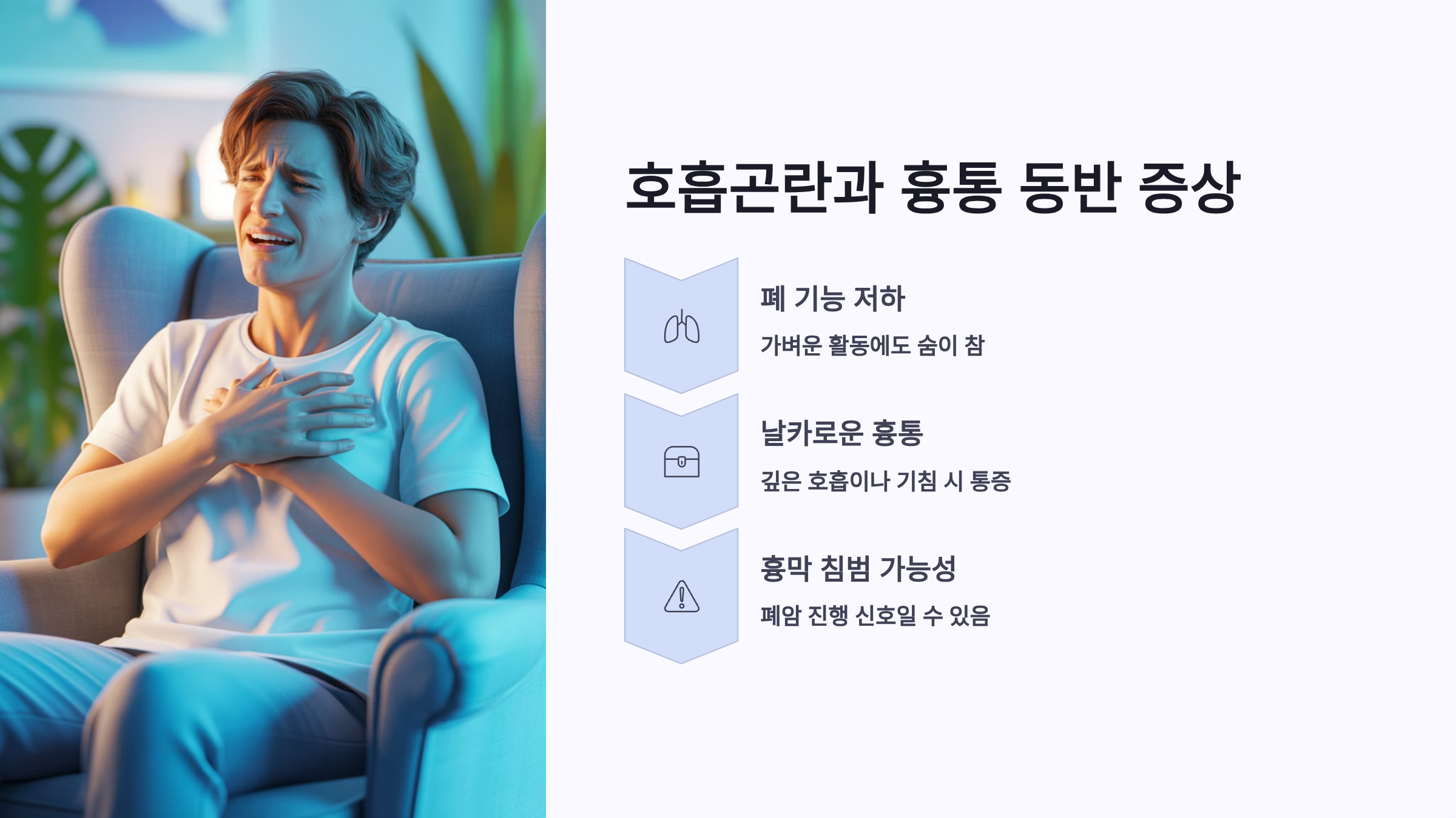 폐암이 진행되면 폐 기능이 저하되어 평소와 달리 가벼운 활동에도 숨이 차게 됩니다. 깊게 숨을 쉬거나 기침할 때 날카로운 흉통이 발생한다면 폐암이 흉막까지 침범했을 가능성이 있습니다. 이러한 증상들은 단독으로 나타나기보다는 여러 증상이 복합적으로 나타나는 경우가 많습니다.