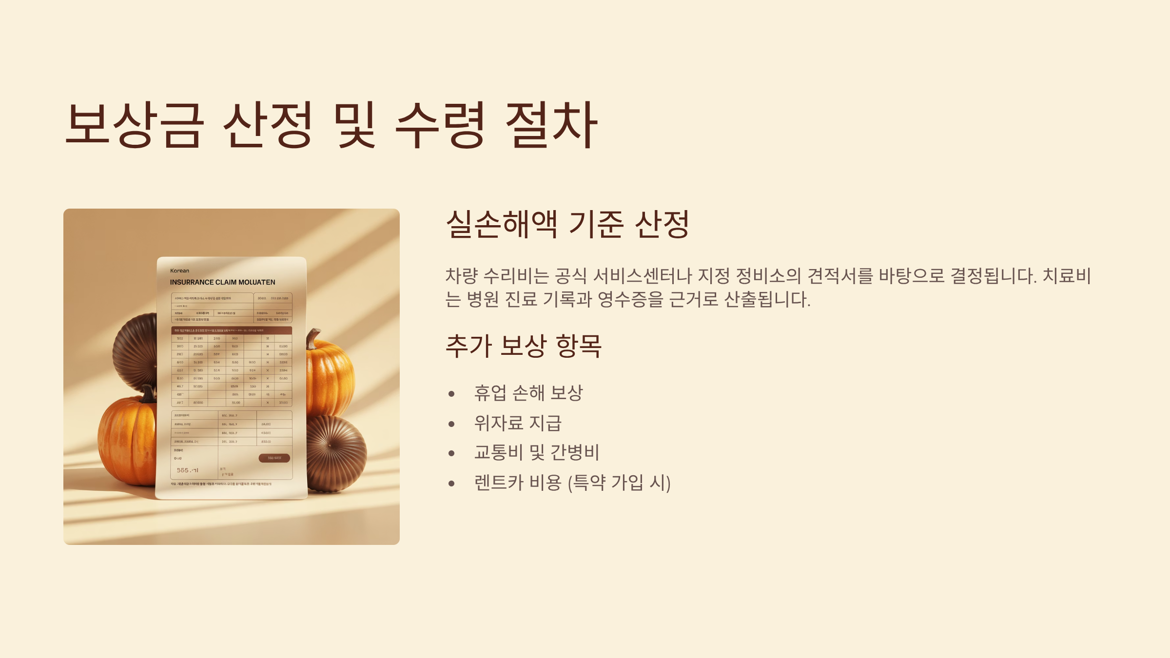 보상금 산정은 실제 손해액을 기준으로 해요. 차량 수리비는 공식 서비스센터나 지정 정비소의 견적서를 바탕으로 결정되고, 치료비는 병원 진료 기록과 영수증을 근거로 산출돼요. 휴업 손해나 위자료 같은 추가 보상도 상황에 따라 받을 수 있어요.