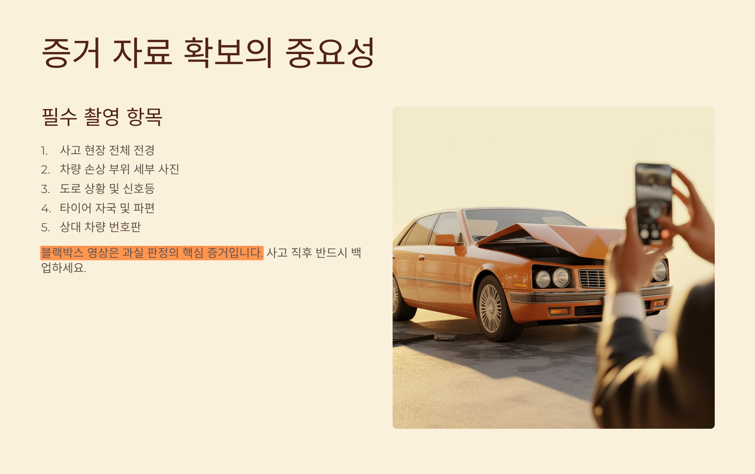 증거 자료 확보는 보상 과정에서 매우 중요해요. 스마트폰으로 사고 현장을 다각도로 촬영하고, 차량 손상 부위를 클로즈업으로 찍어두세요. 블랙박스 영상은 반드시 백업하고, 목격자가 있다면 연락처를 받아두는 것도 잊지 마세요.