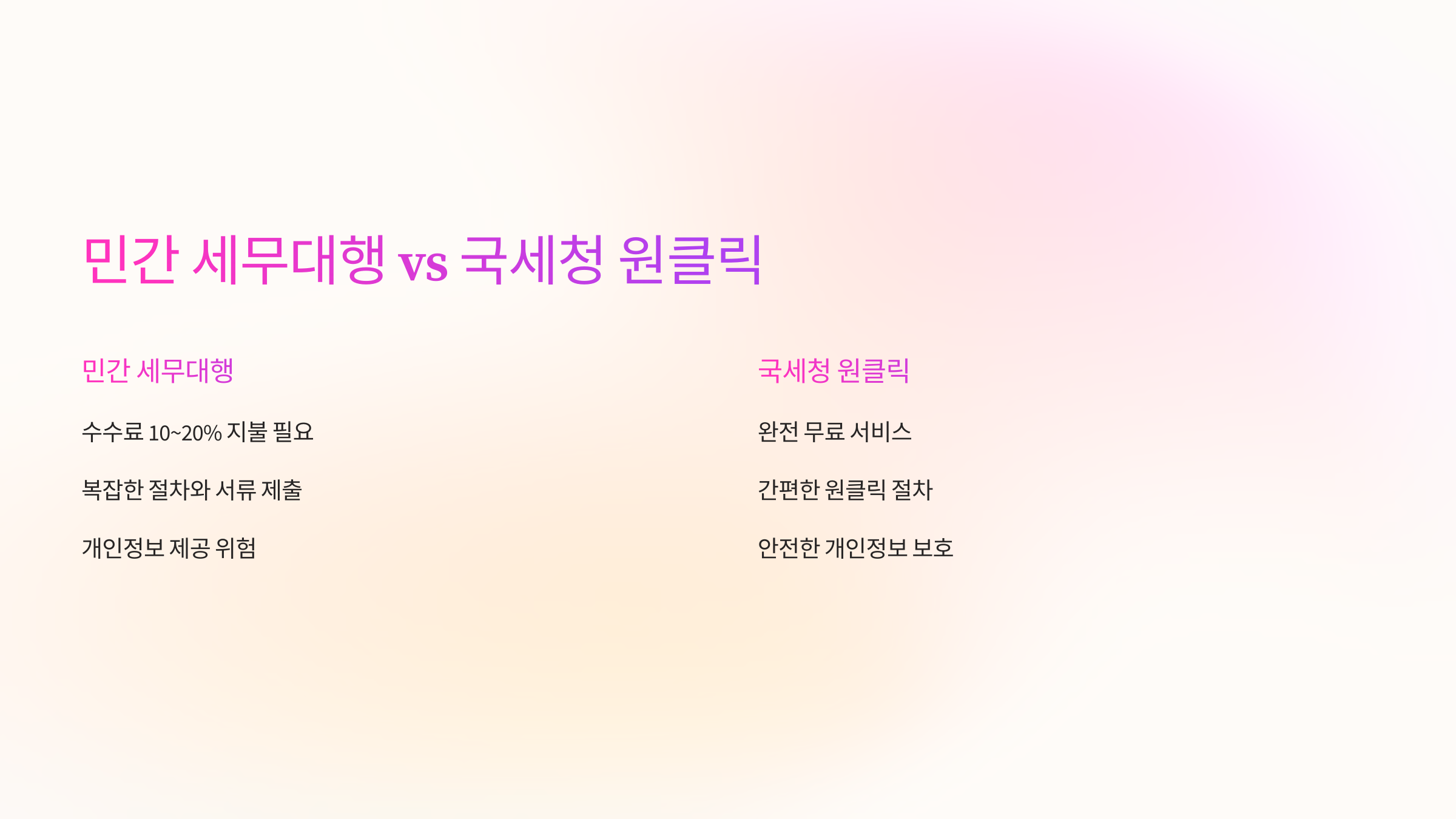 | 구분 | 민간 세무대행 | 국세청 직접신청 |