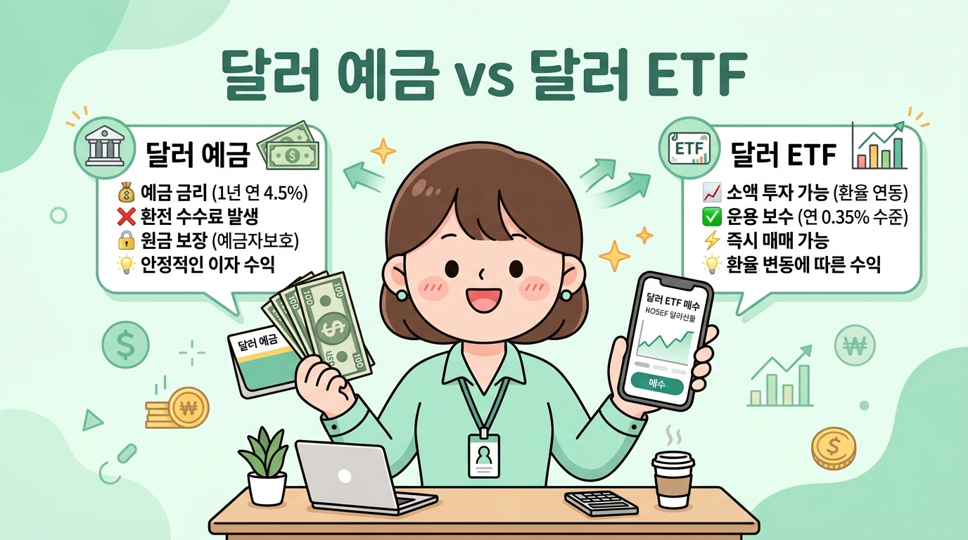 달러 예금은 5,000만 원까지 예금자 보호가 되지만, 환율 하락 시 환차손이 발생할 수 있고, 환전 수수료(약 1~1.8%)가 별도로 들어간다는 점을 기억하세요.