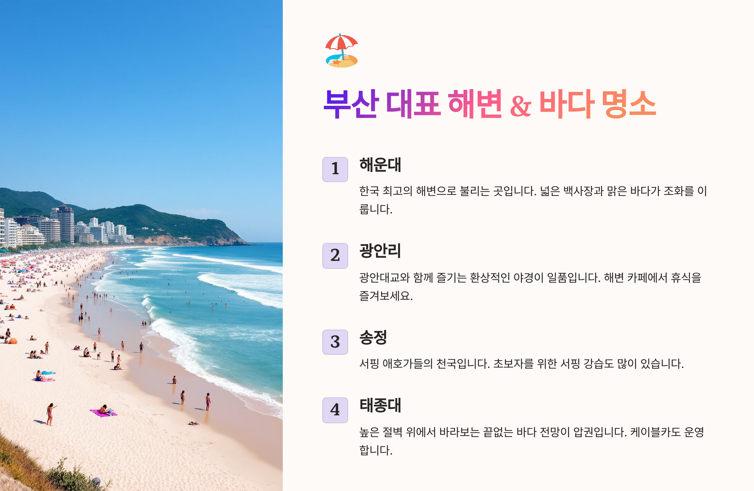 부산은 대한민국을 대표하는 해양 도시로, 아름다운 해변과 맛있는 음식, 그리고 감성적인 여행지가 가득한 곳이에요! 🏝️