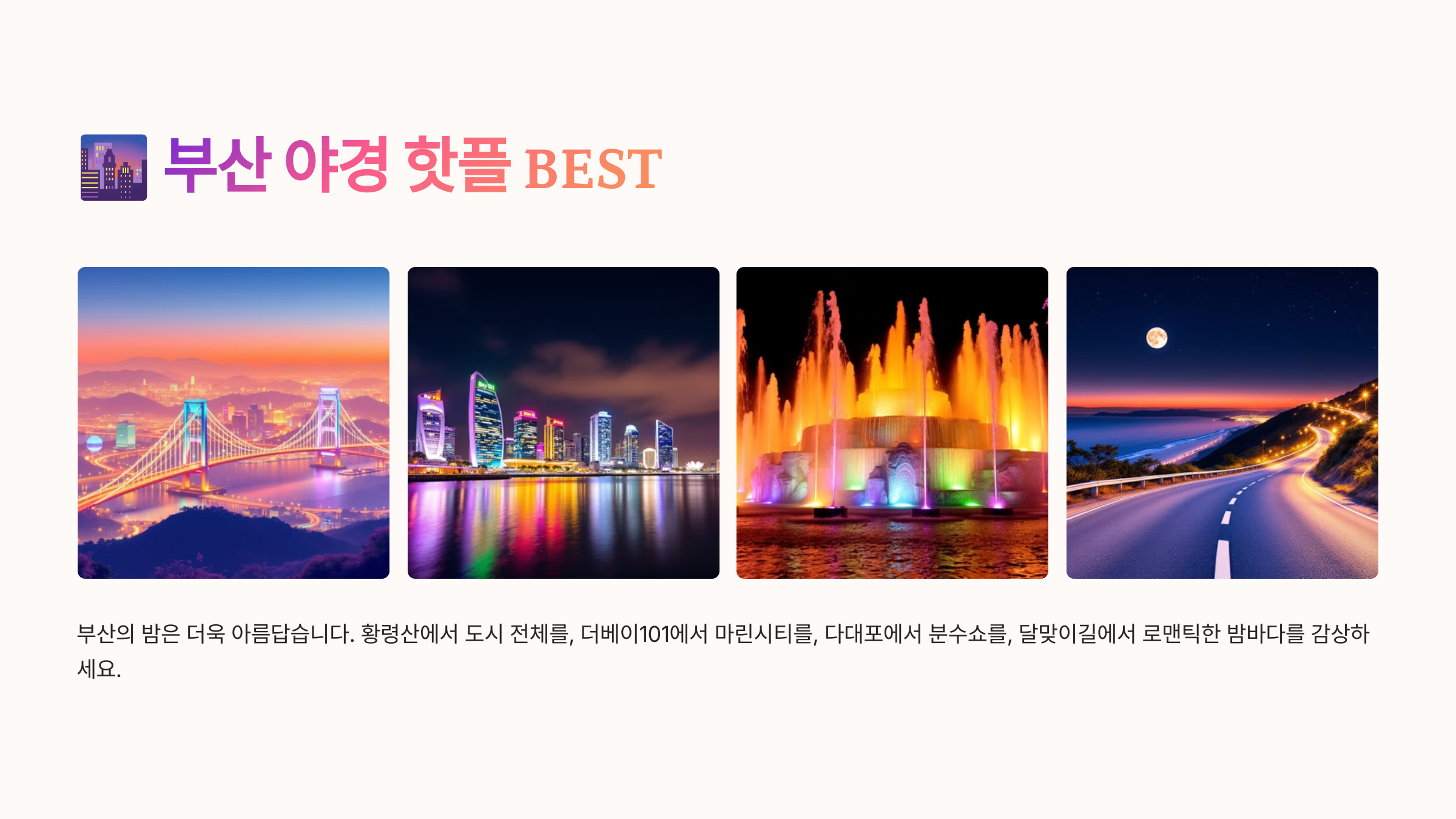 부산의 밤은 낮보다 더 아름답죠! 부산에서 꼭 봐야 할 야경 명소들을 소개할게요. 🌃✨