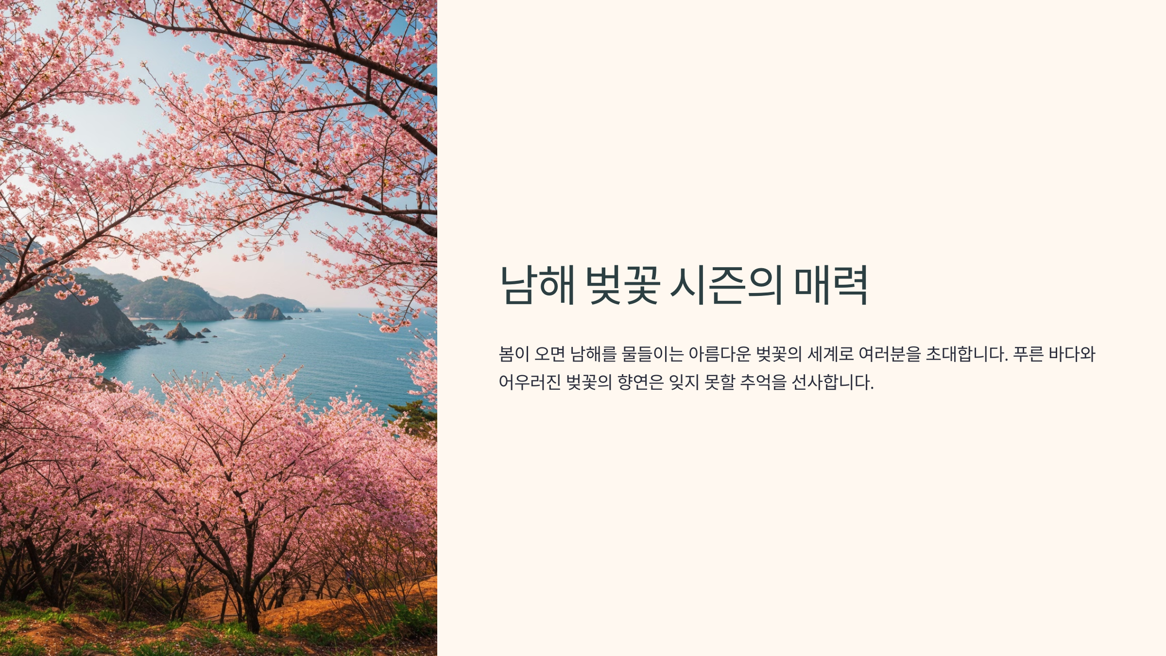 특히 남해의 벚꽃은 바다를 배경으로 감상할 수 있어 다른 지역과는 또 다른 매력을 가지고 있어요. 해안도로를 따라 드라이브하면서 벚꽃길을 달리거나, 독일마을의 유럽풍 건물들과 함께 색다른 벚꽃 사진을 남길 수도 있어요.