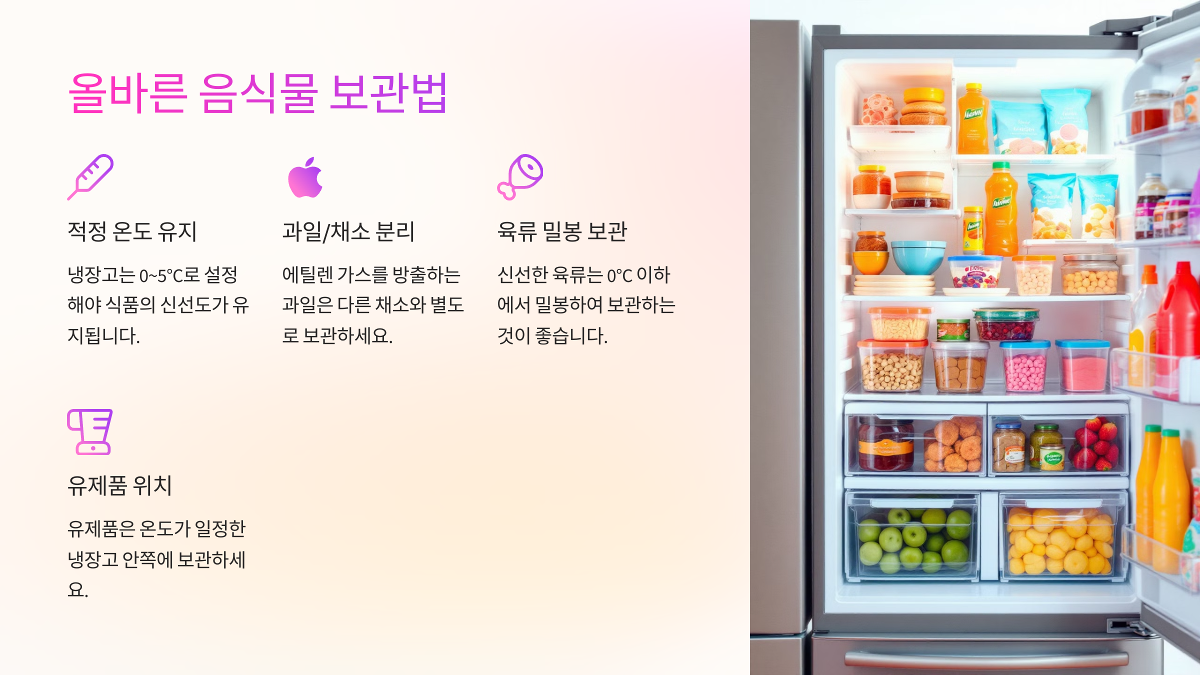 - 🧀 유제품: 냉장(1~4°C), 개봉 후 빠른 소비 권장