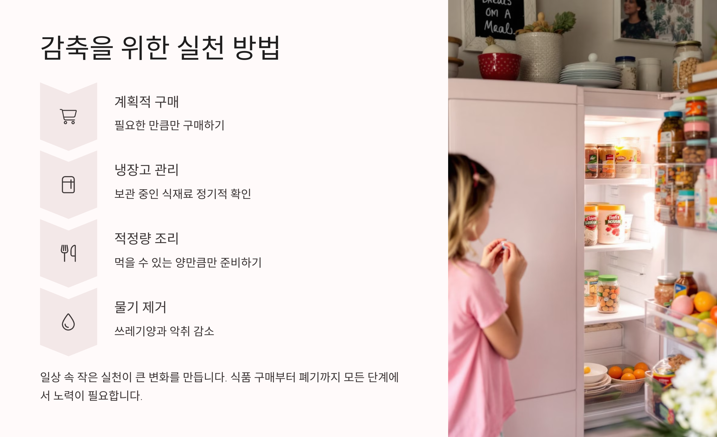 - 식재료를 필요한 만큼만 구입하기 - 충동 구매를 줄이면 음식물 낭비도 줄어들어요.